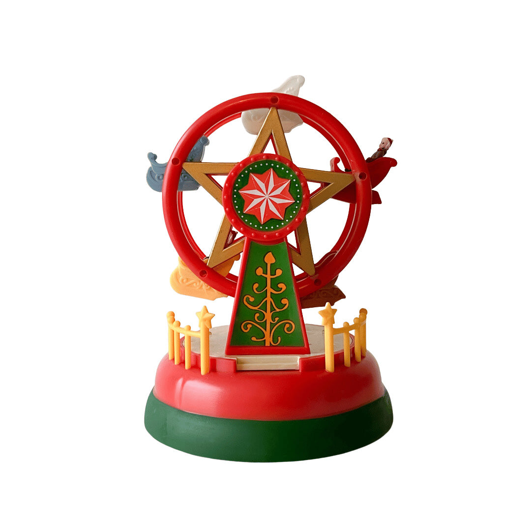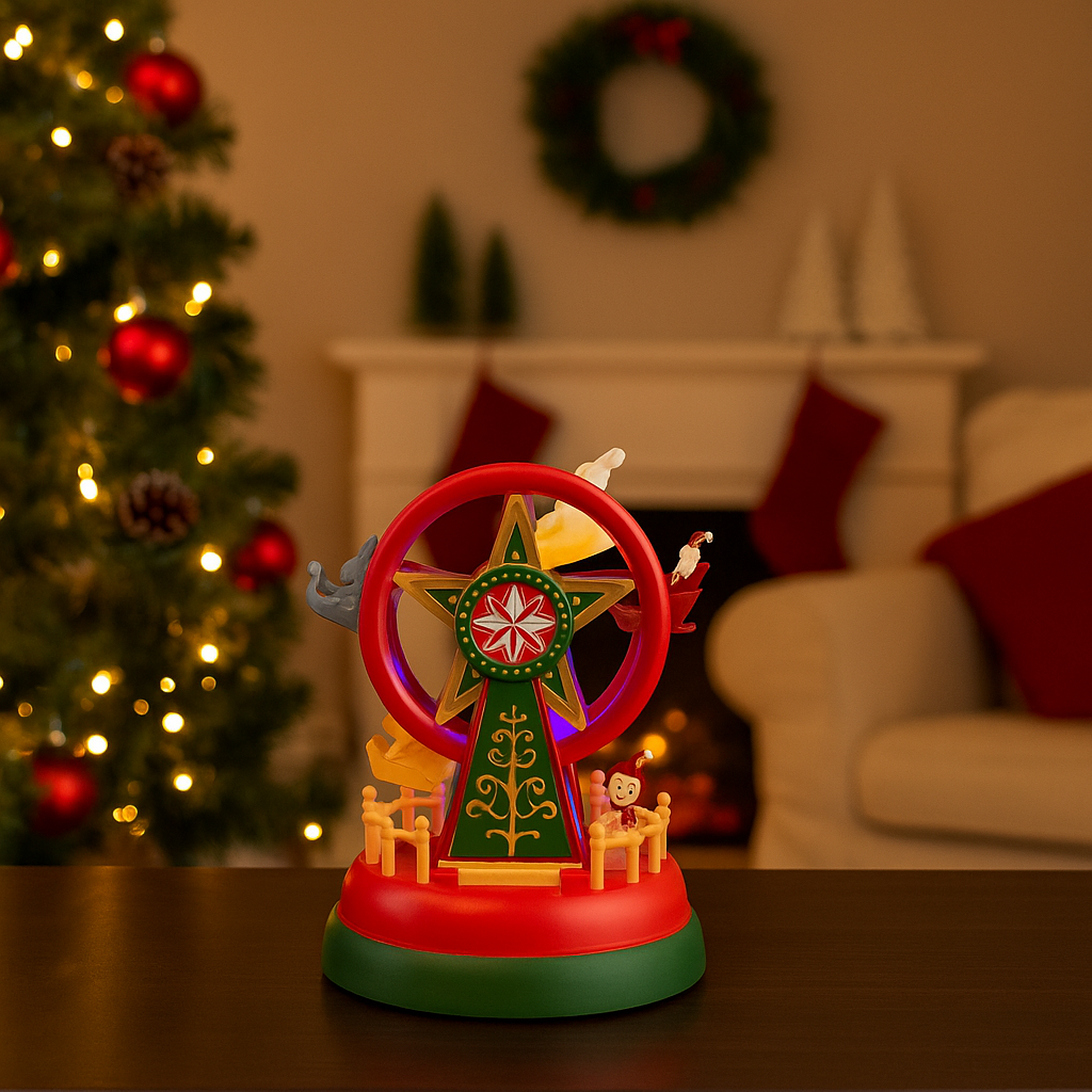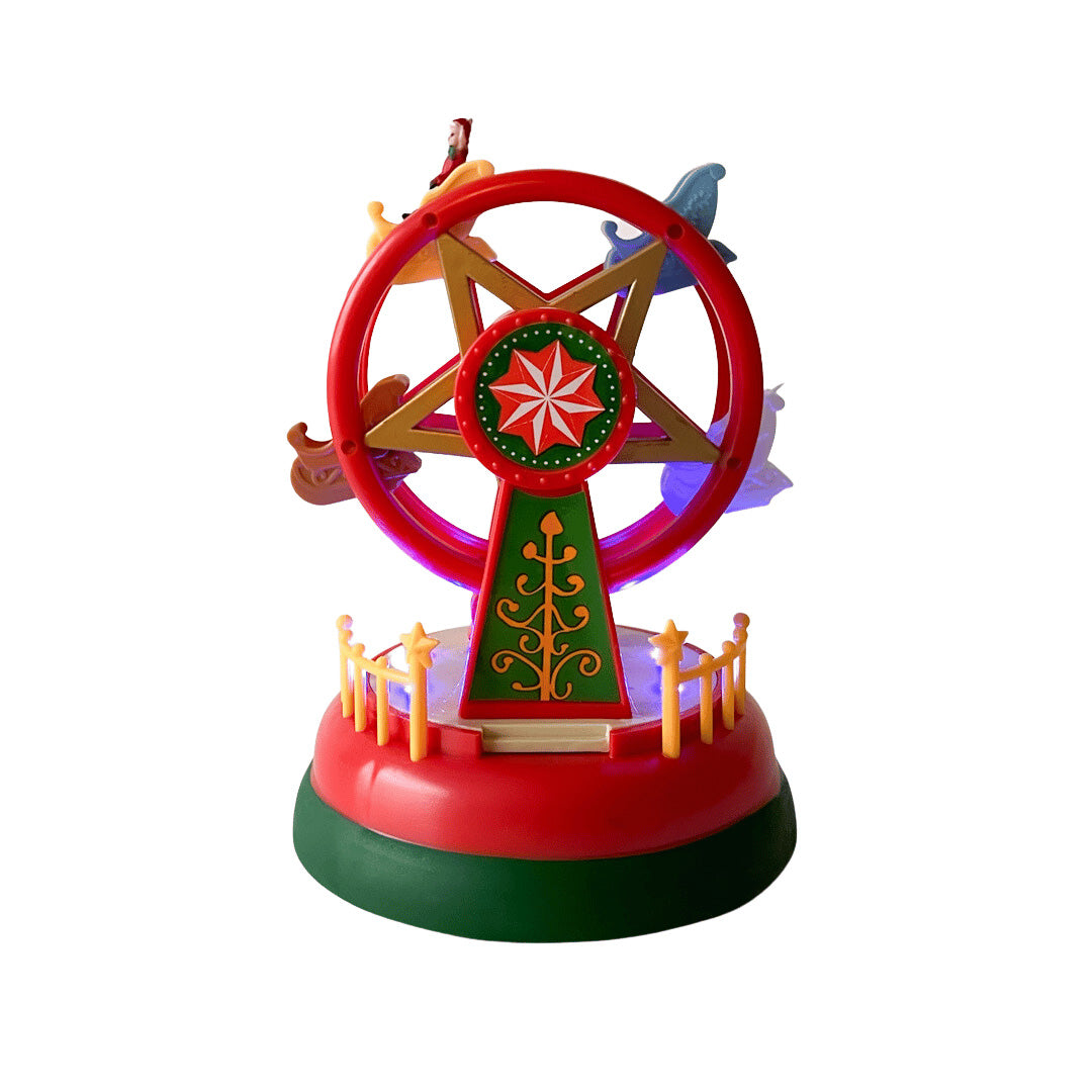 Et sjarmerende lite pariserhjul som både lyser opp og roterer når det skrus på. LED-lysene gir en varm og livlig glød som skaper ekte julestemning. Passer perfekt som en del av julebyen, på peishylla eller i vinduet. Kan brukes alene eller sammen med annen julepynt for et helhetlig uttrykk.