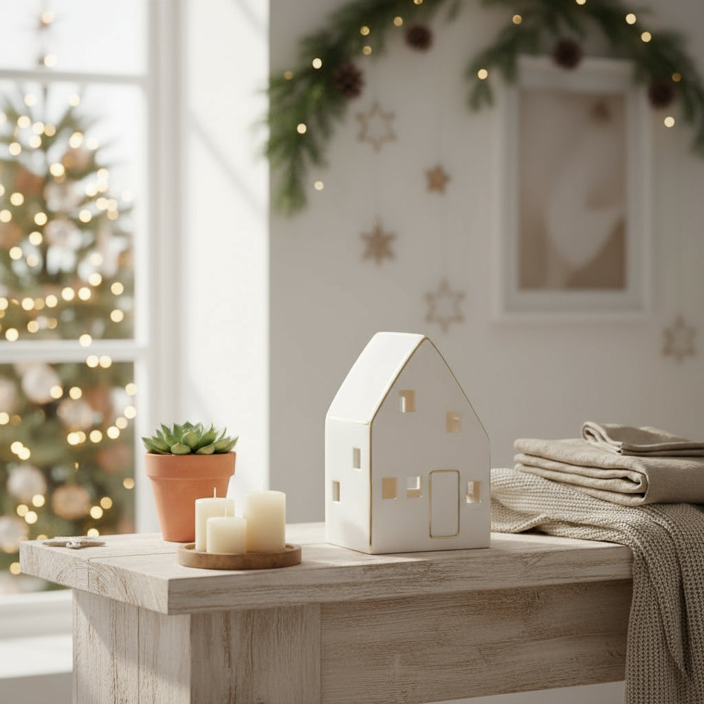 Lite keramikkhus i hvit finish med vinduer og dør – enkel og elegant interiørdekorasjon.