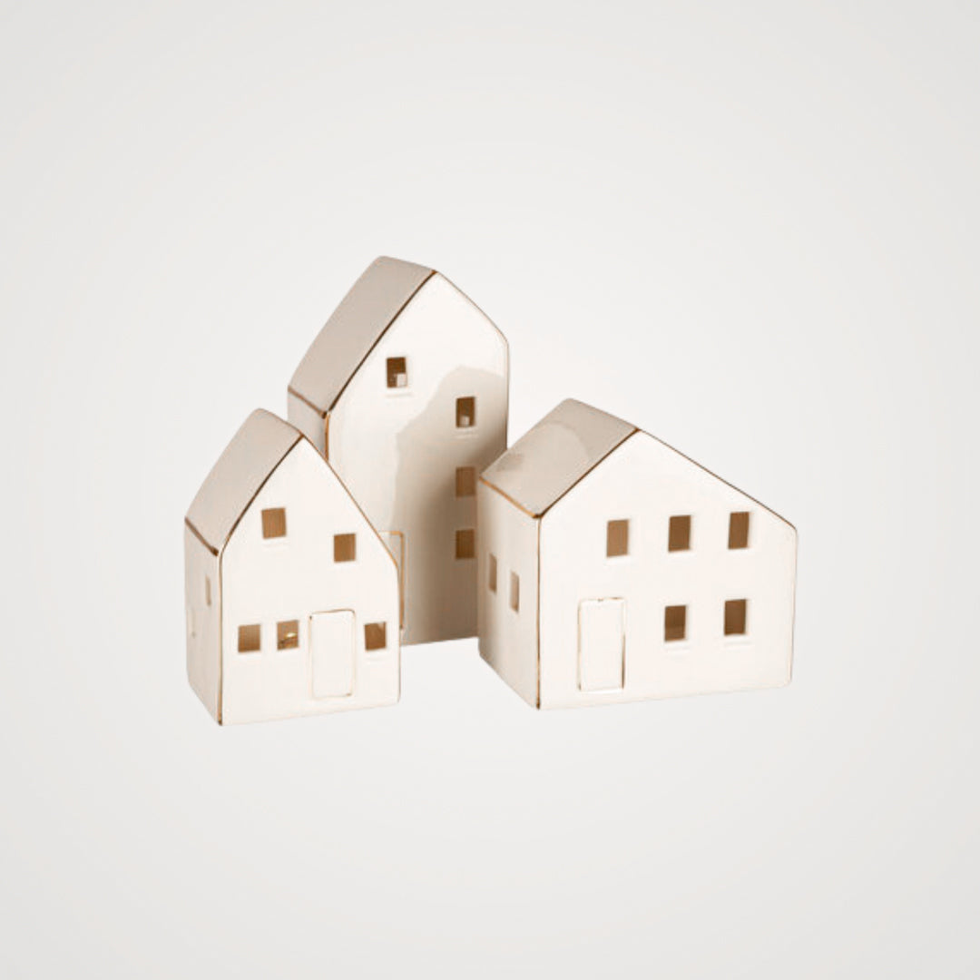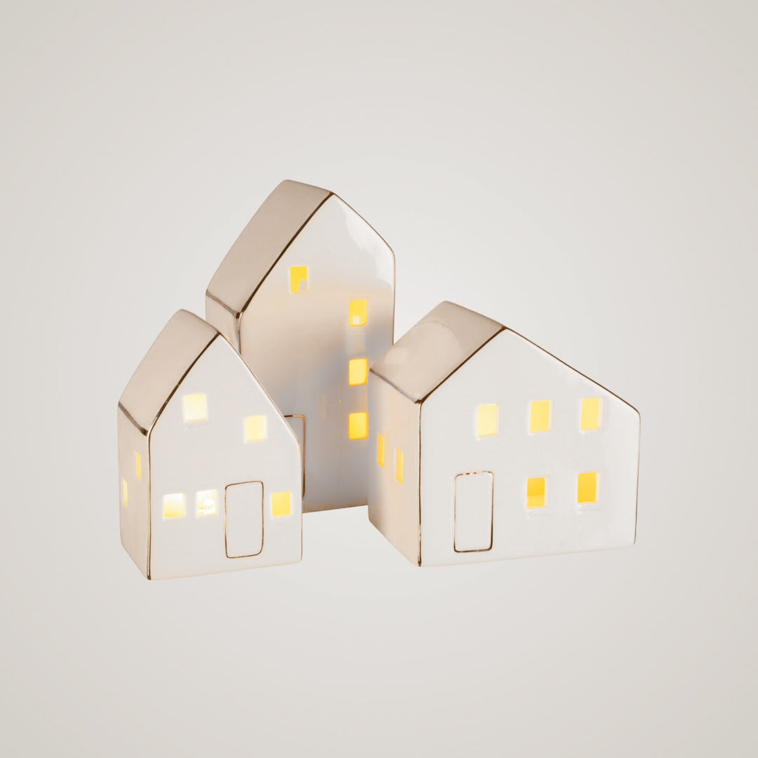 Nordby liten er et dekorativt keramikkhus med innebygd LED-lys som gir en myk og varm glød. De små vinduene slipper lyset fint gjennom og skaper en rolig stemning i rommet. De diskrete gullfargede detaljene gir et hint av eleganse uten å ta for mye oppmerksomhet.