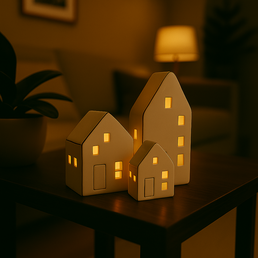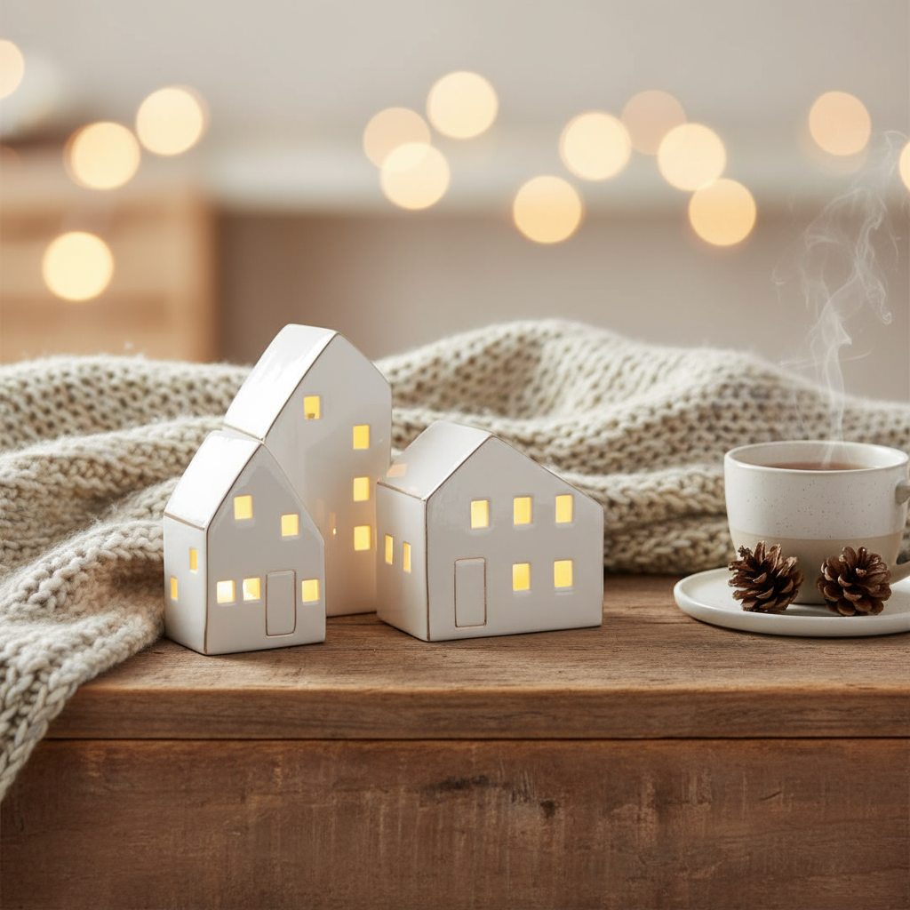 Tre keramikkhus med tent lys i vinduene, plassert koselig på bord i stue med dempet belysning.