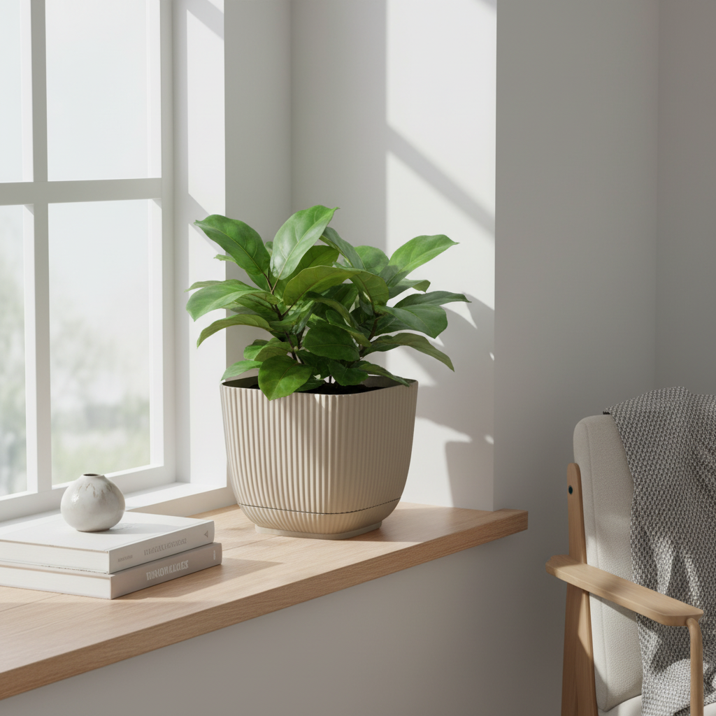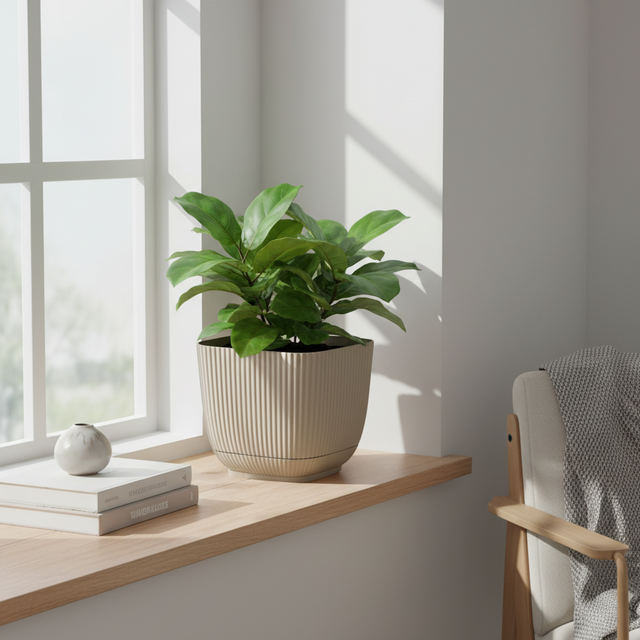 Gi plantene dine en stilren base med denne dekorative plastpotten i beige.