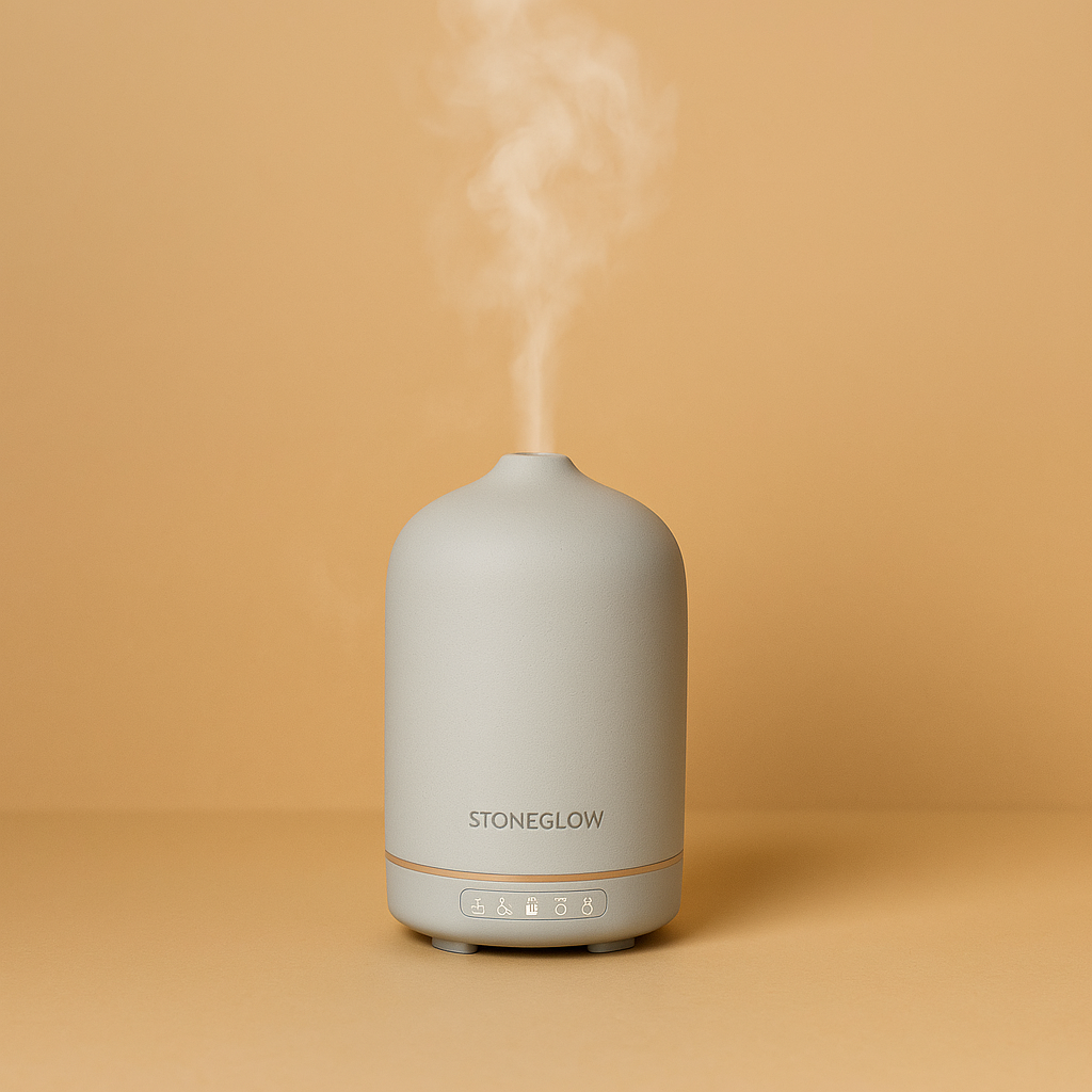 Denne aromadiffuseren i elegant grått sprer en behagelig duft i hjemmet og skaper en avslappende atmosfære.