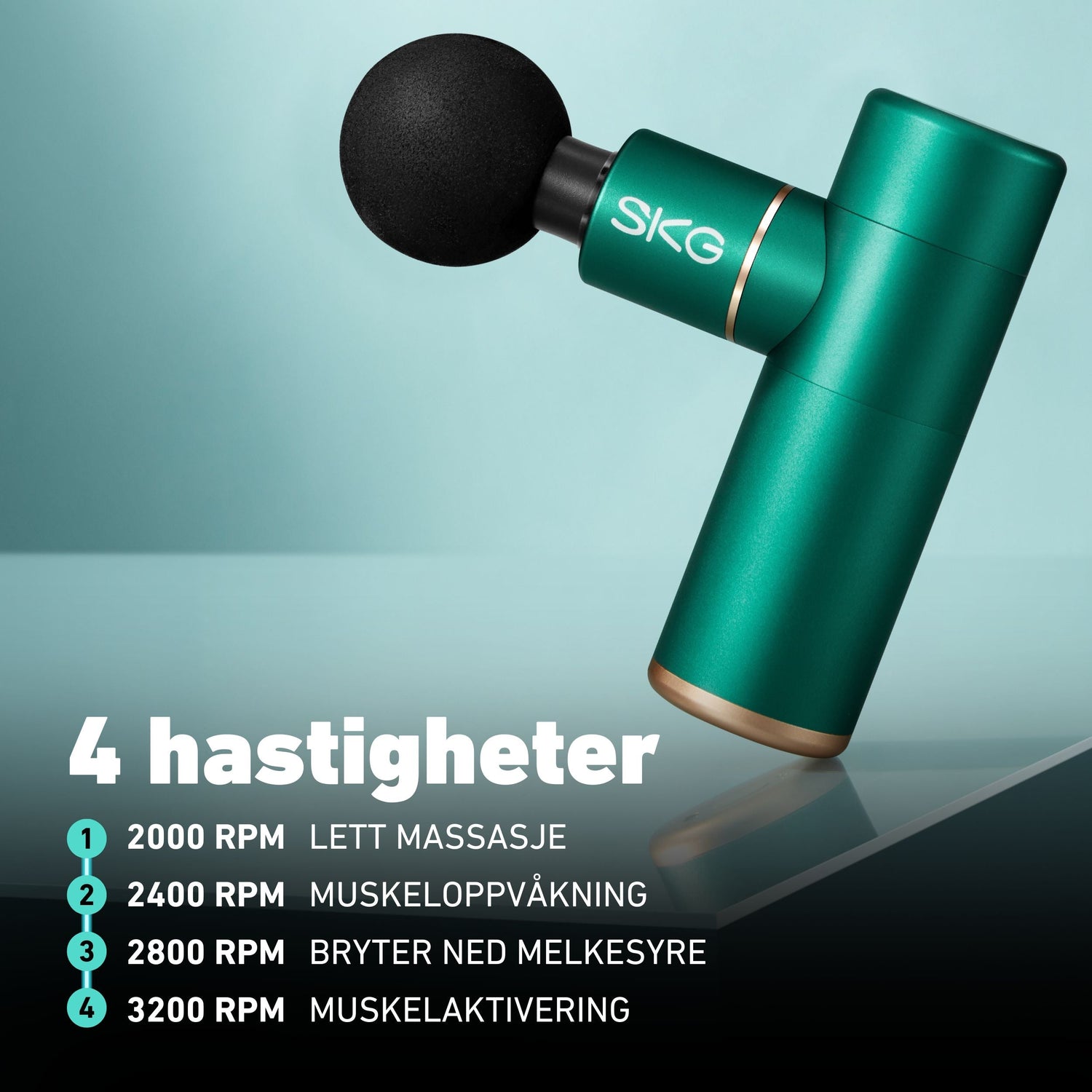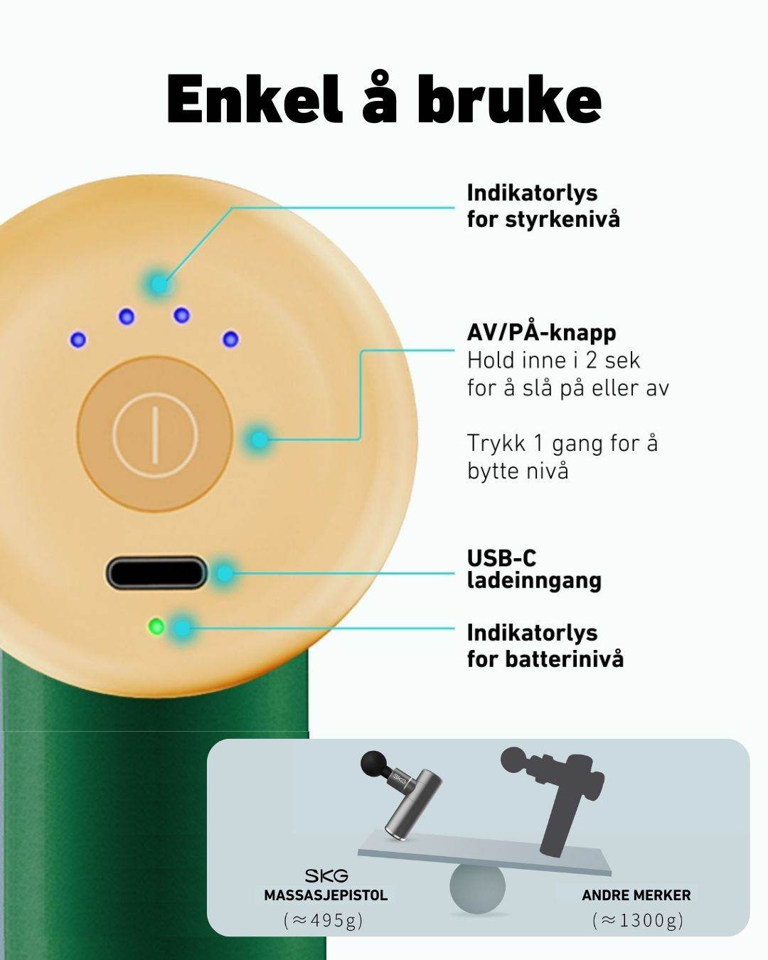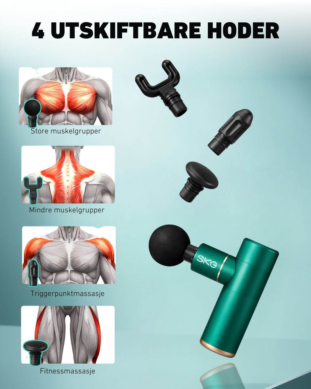 Opplev effektiv muskelavslapning uansett hvor du er. Med en vekt på kun 495 gram og fire utskiftbare massasjehoder, gir SKG F3 massasjepistol deg profesjonell behandling i et kompakt design.