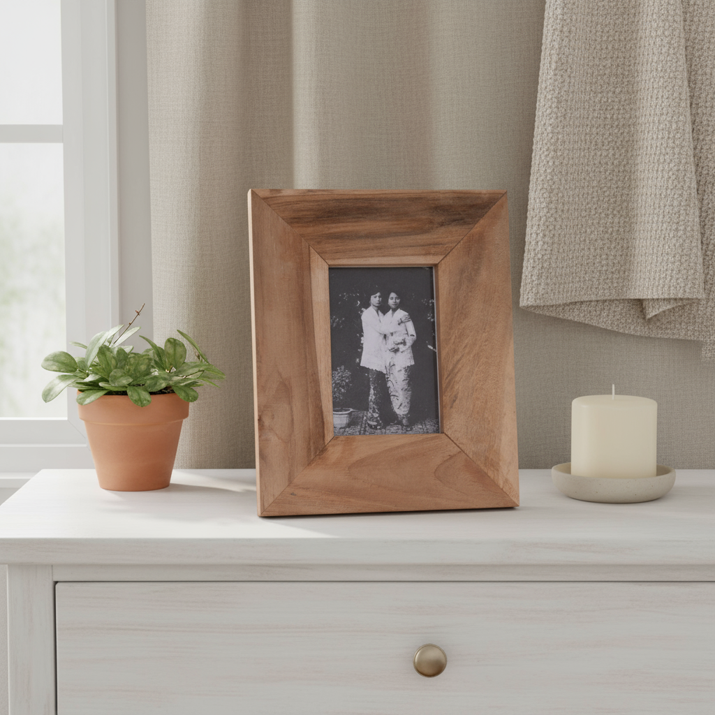 Den solide trerammen fremhever bildet på en harmonisk måte, og passer like godt til familiebilder som naturmotiver.