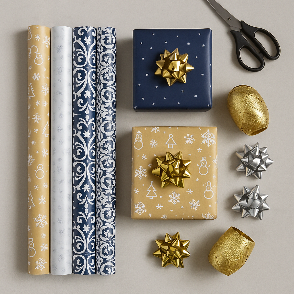 Gavesett julepapir med fire ruller i gull, hvitt og blått med julemotiv, sett fra skrå vinkel på bord – inkluderer gavebånd og sløyfer.