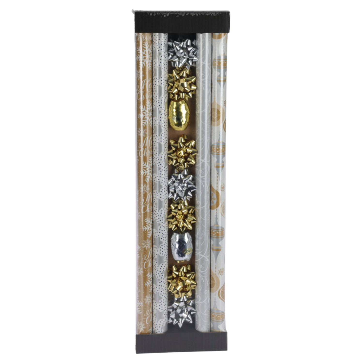 Gi julegavene en eksklusiv innpakning med dette komplette gavesettet i gavepapir. Settet inneholder flere ruller gavepapir i gull, sølv og hvitt med vakre julemotiv, samt matchende gavebånd og buer som gjør det enkelt å skape en helhetlig og stilfull gaveinnpakking.
