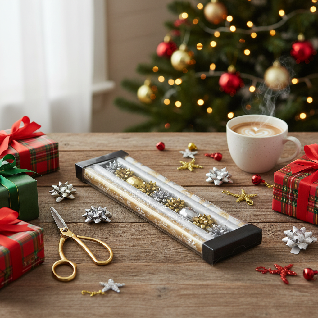 Med dette settet får du alt du trenger for å gi pakkene et luksuriøst uttrykk under juletreet, uten å måtte kjøpe tilbehør separat.