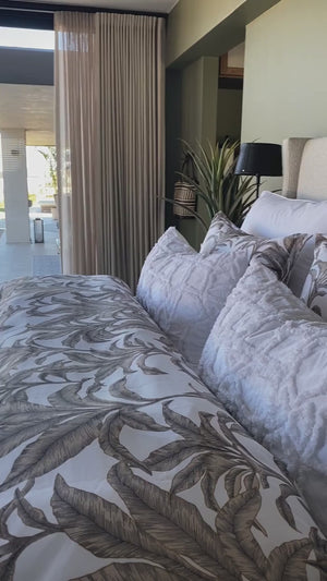 Babylonstoren sengesett fra Halvor Bakke bringer en eksklusiv følelse av natur og ro inn i soverommet. Det delikate palmebladmønsteret gir et moderne preg med inspirasjon fra tropiske omgivelser, og den dype beige tonen tilfører varme og karakter.