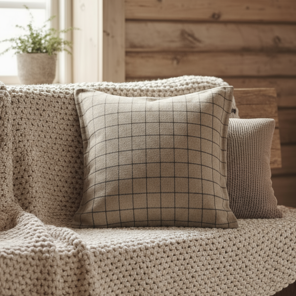 Gi hjemmet et harmonisk uttrykk med Halvor Bakke Liam putetrekk. Den beige fargen og det rutete mønsteret gir rommet en lun og moderne følelse. Putetrekket er laget av resirkulert ull, noe som gir både tekstur, kvalitet og et bærekraftig preg.