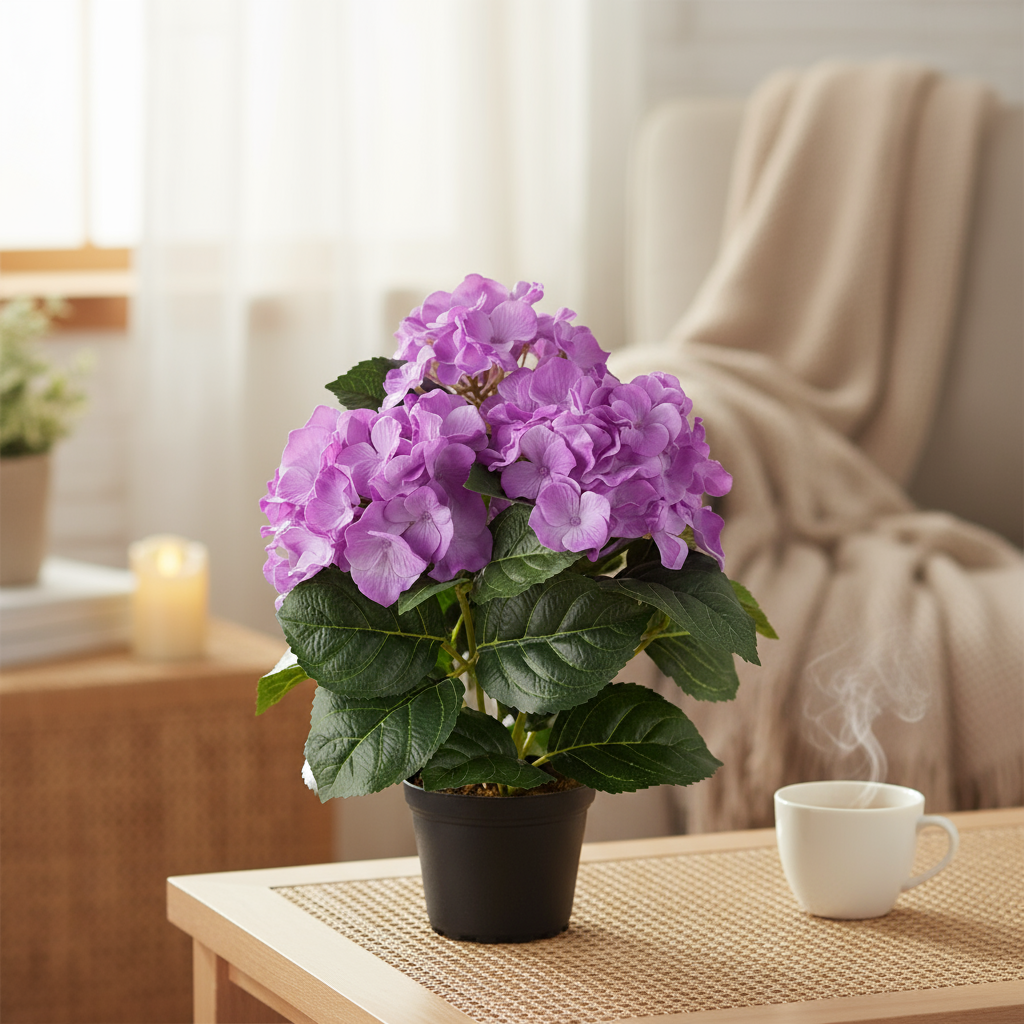 Lilla hortensiablomst i beige potte plassert i en vinduskarm i en lun stue med utsikt mot grønne trær og natur.