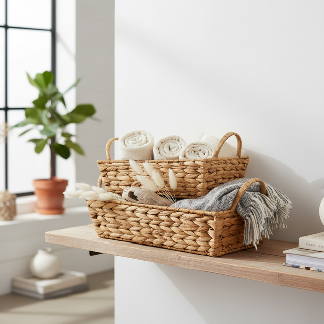 Oppgrader oppbevaringen din med dette settet bestående av to flettede kurver i rektangulær form. Kurvene kombinerer praktisk funksjon med et varmt og naturlig uttrykk som passer inn i de fleste hjem.