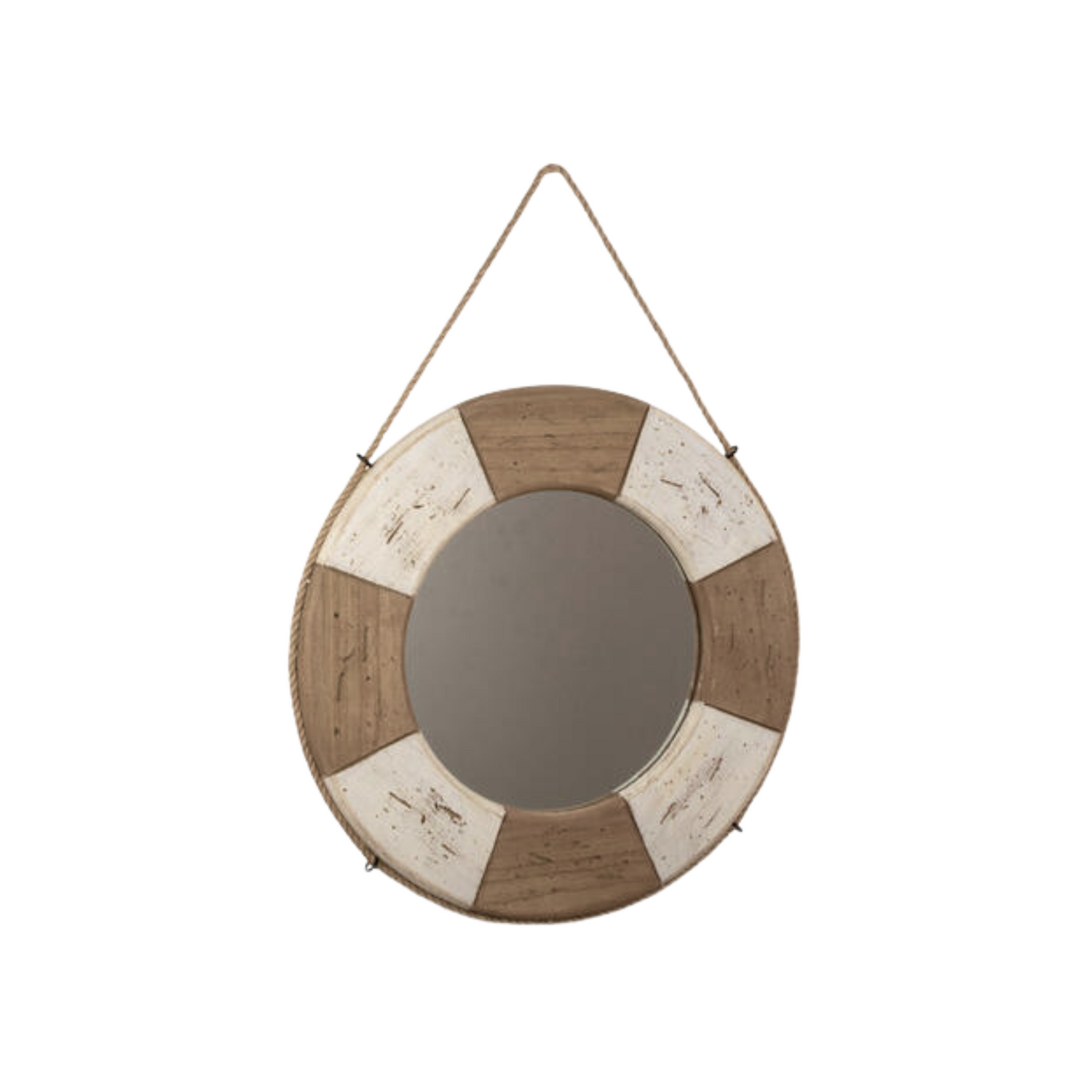 Dette runde speilet er designet som en livbøye, og gir et lekent og rustikt uttrykk til hjemmet eller hytta. Med detaljer i tre og oppheng i tau bringer det tankene til kystliv og sjøbris. Perfekt som veggdekor i gangen, på badet, eller som en stemningsfull detalj i sommerhuset.