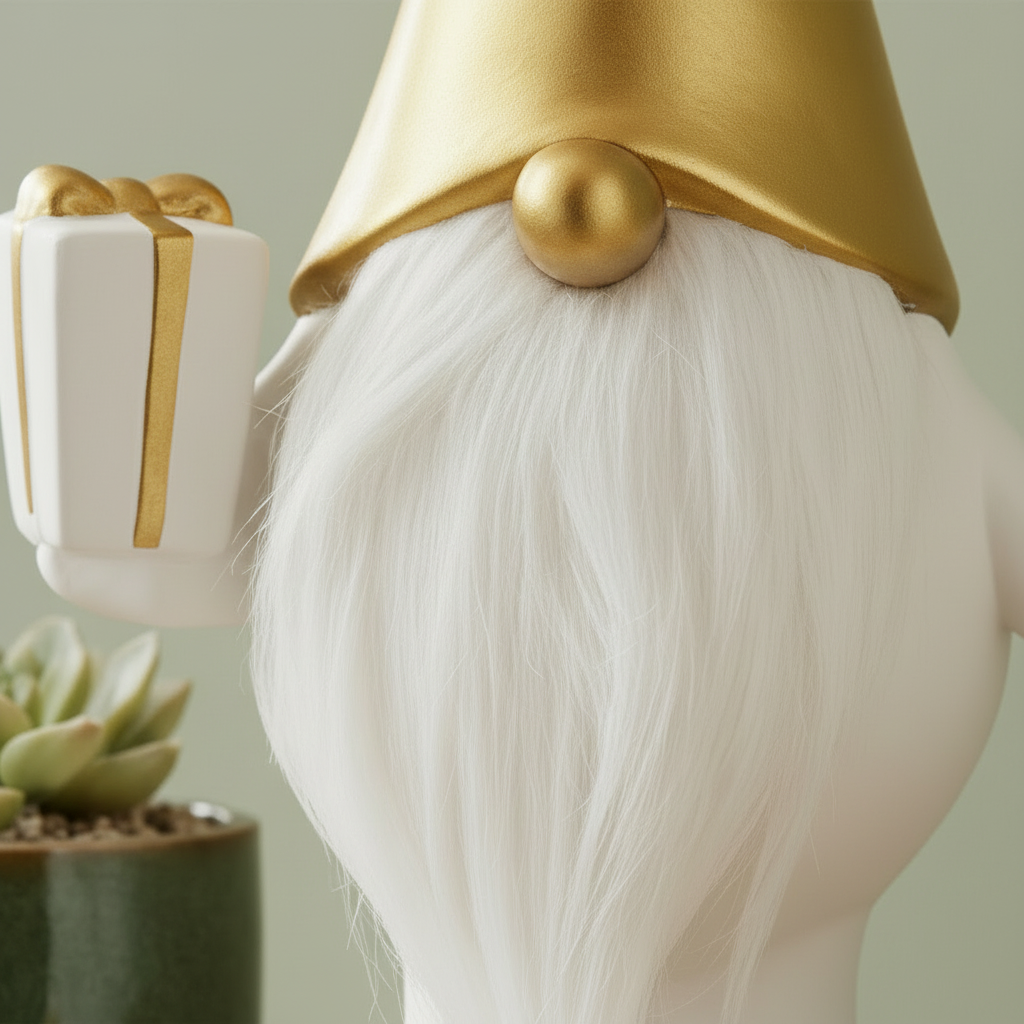 Lekker nissefigur i hvitt og gull laget i porselen. Den moderne designen kombinert med klassiske detaljer gjør denne figuren til et perfekt innslag i juledekorasjonen.