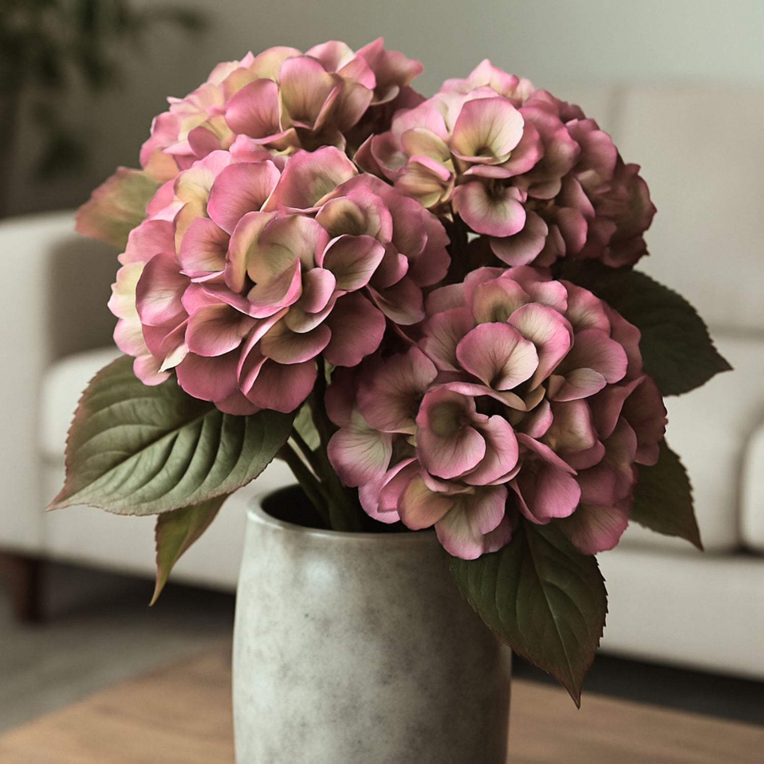 Nærbilde av kunstig hortensia i rosa toner med realistiske blader, plassert i grå keramikkvase på bord i stilren og lun stue.