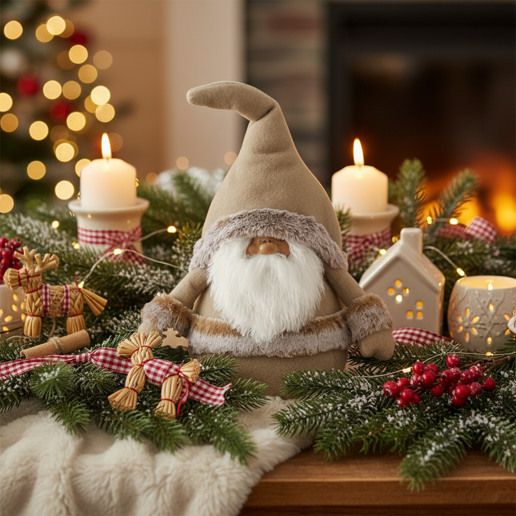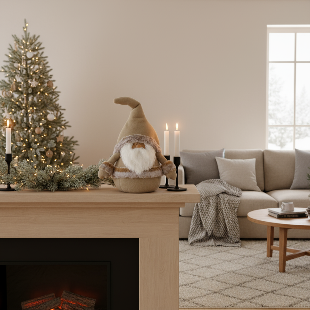 Håndlaget nissefigur i beige og hvitt som skaper en lun og koselig julestemning i hjemmet. Brodie har et moderne uttrykk kombinert med klassiske detaljer, og passer like godt på stuebordet som på peishyllen eller i gangen. Den nøytrale fargepaletten gjør figuren enkel å kombinere med annen julepynt.
