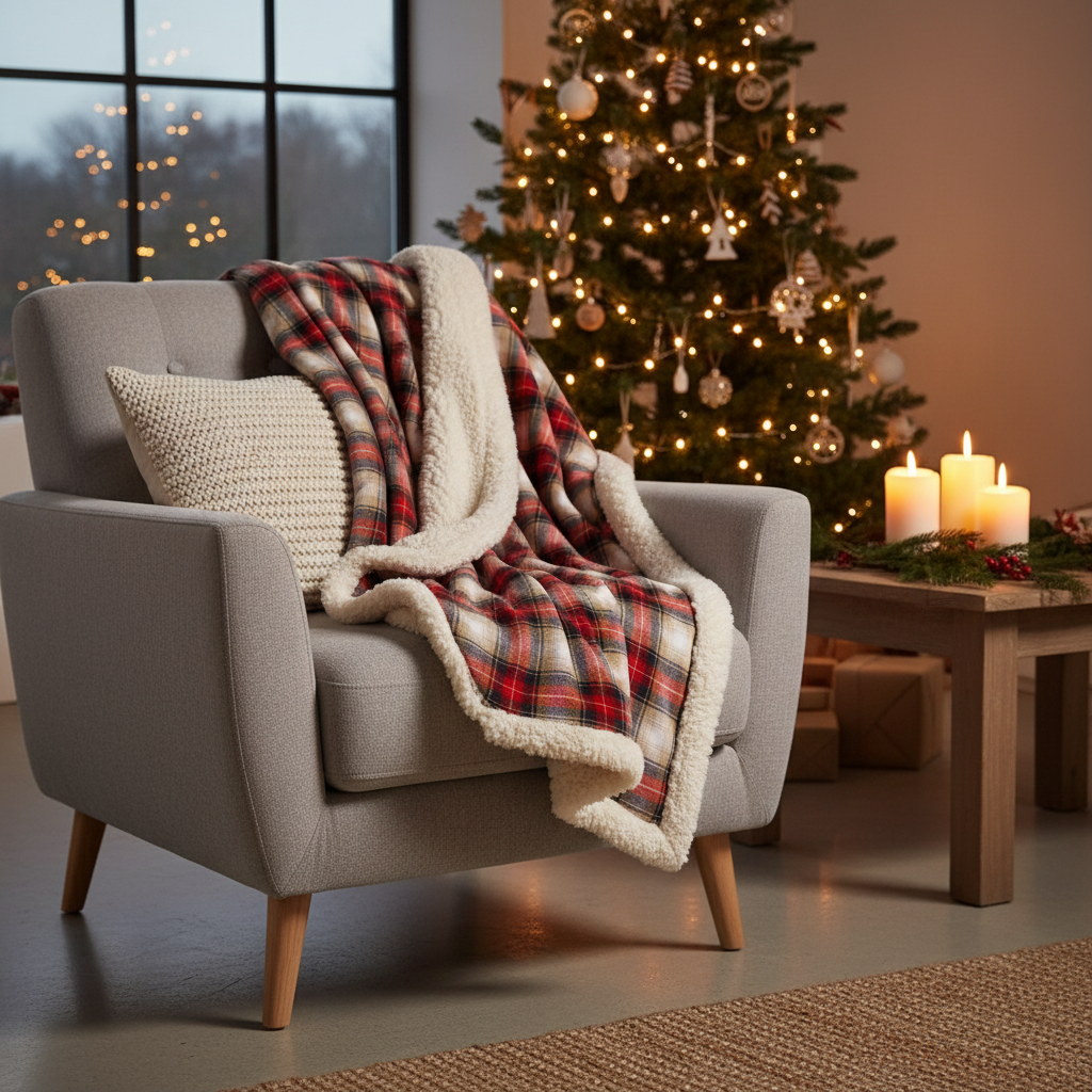 Lun og trivelig jule-pledd i rutete mønster i fargene, rød, hvit, beige og sort. Skap den perfekt julestemningen med dette fantastisk varme og gode pleddet.