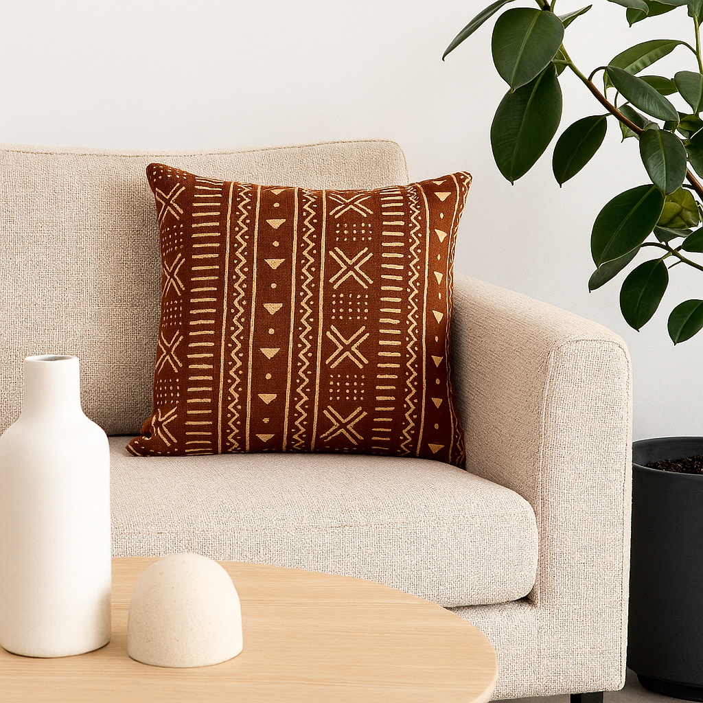 Putetrekket har en dyp rødbrun rustfarge, kombinert med et elegant, gullaktig mønster som gir et varmt og sofistikert uttrykk.