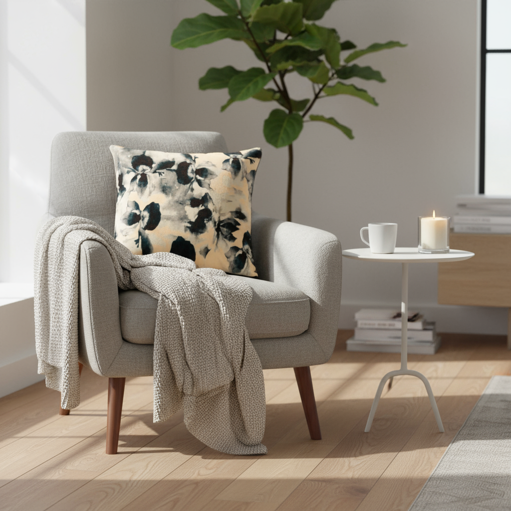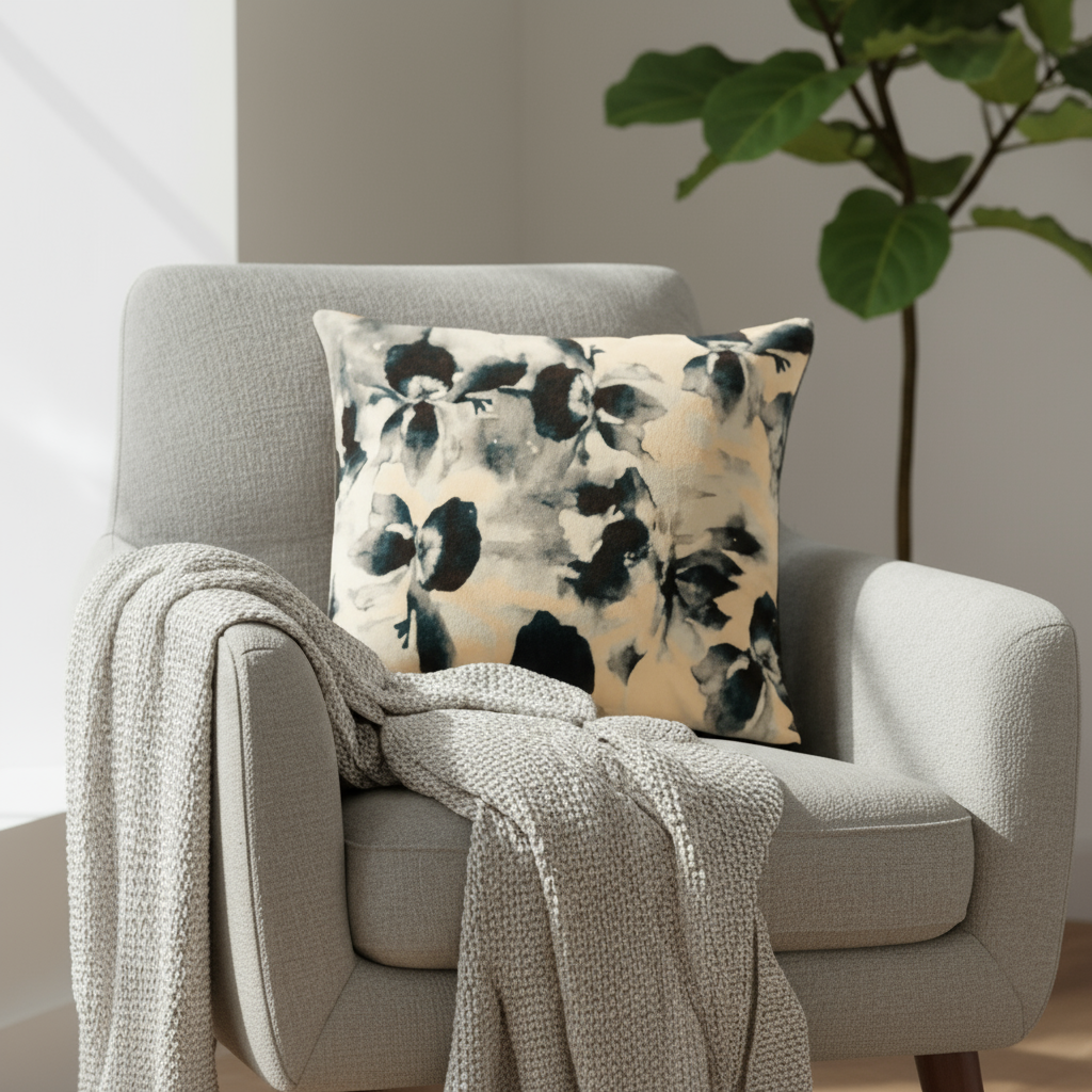 Dekorativt putetrekk i blå velur med moderne akvarelltrykk. Det myke materialet reflekterer lys på en elegant måte og gir en varm, lun stemning. Passer perfekt i kombinasjon med ensfargede puter i blått, grått eller beige.