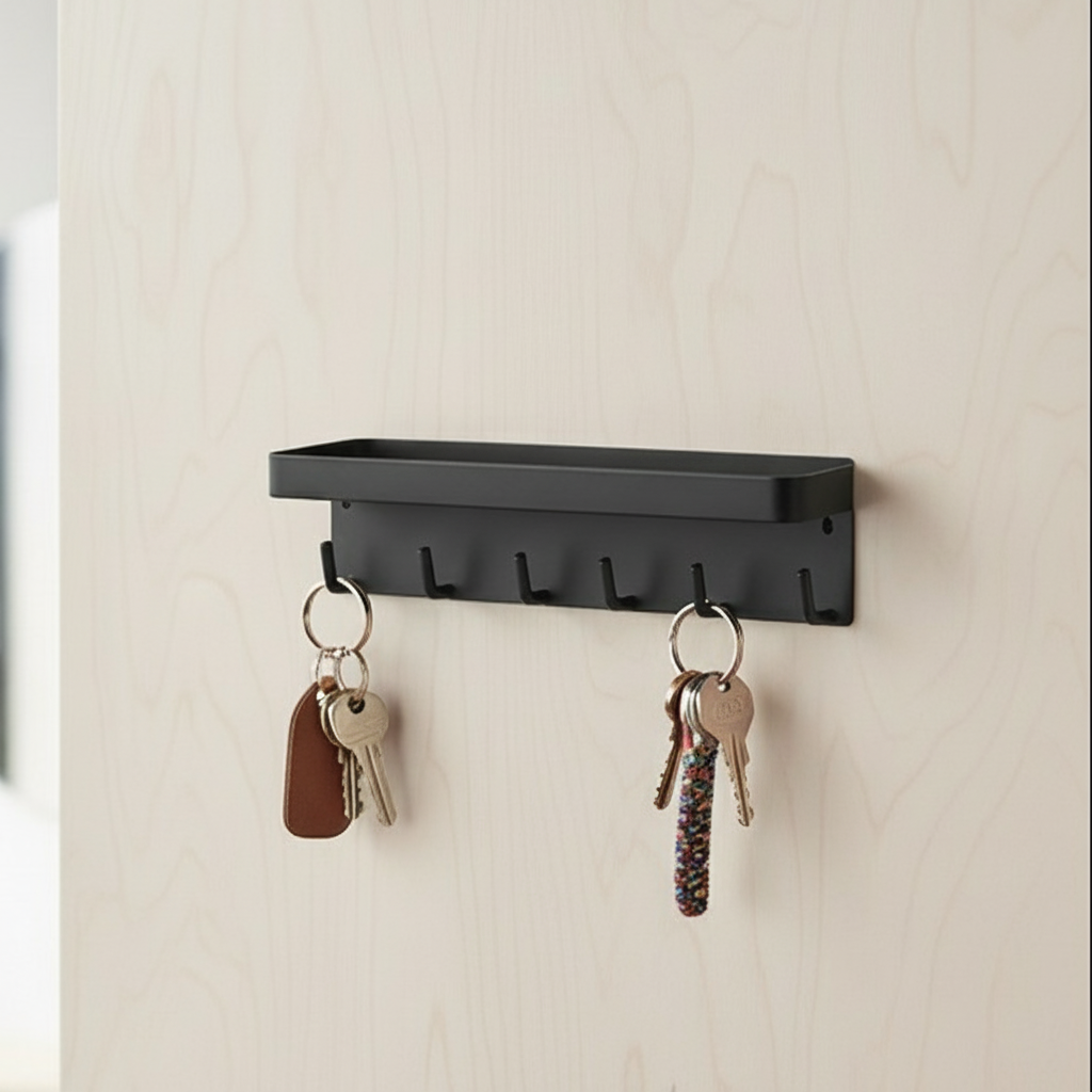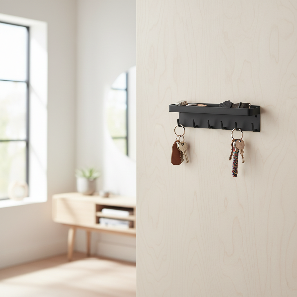 Hold orden på nøklene med denne praktiske selvklebende nøkkelholderen! Laget for å gjøre hverdagen enklere, kan den enkelt festes på veggen uten behov for verktøy eller boring. Den kraftige klebemekanismen gir sikker montering på de fleste glatte overflater, som fliser, glass eller metall. Med sitt stilrene og kompakte design passer nøkkelholderen perfekt i gangen, på kontoret, eller ved inngangsdøren.