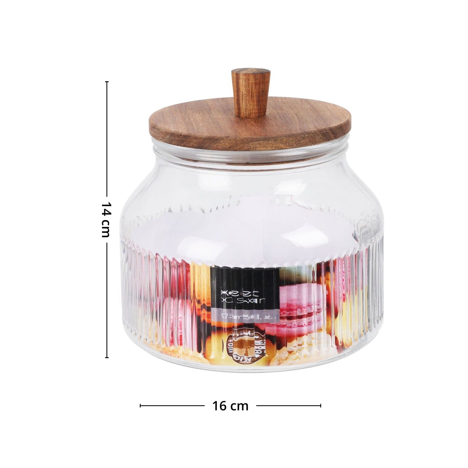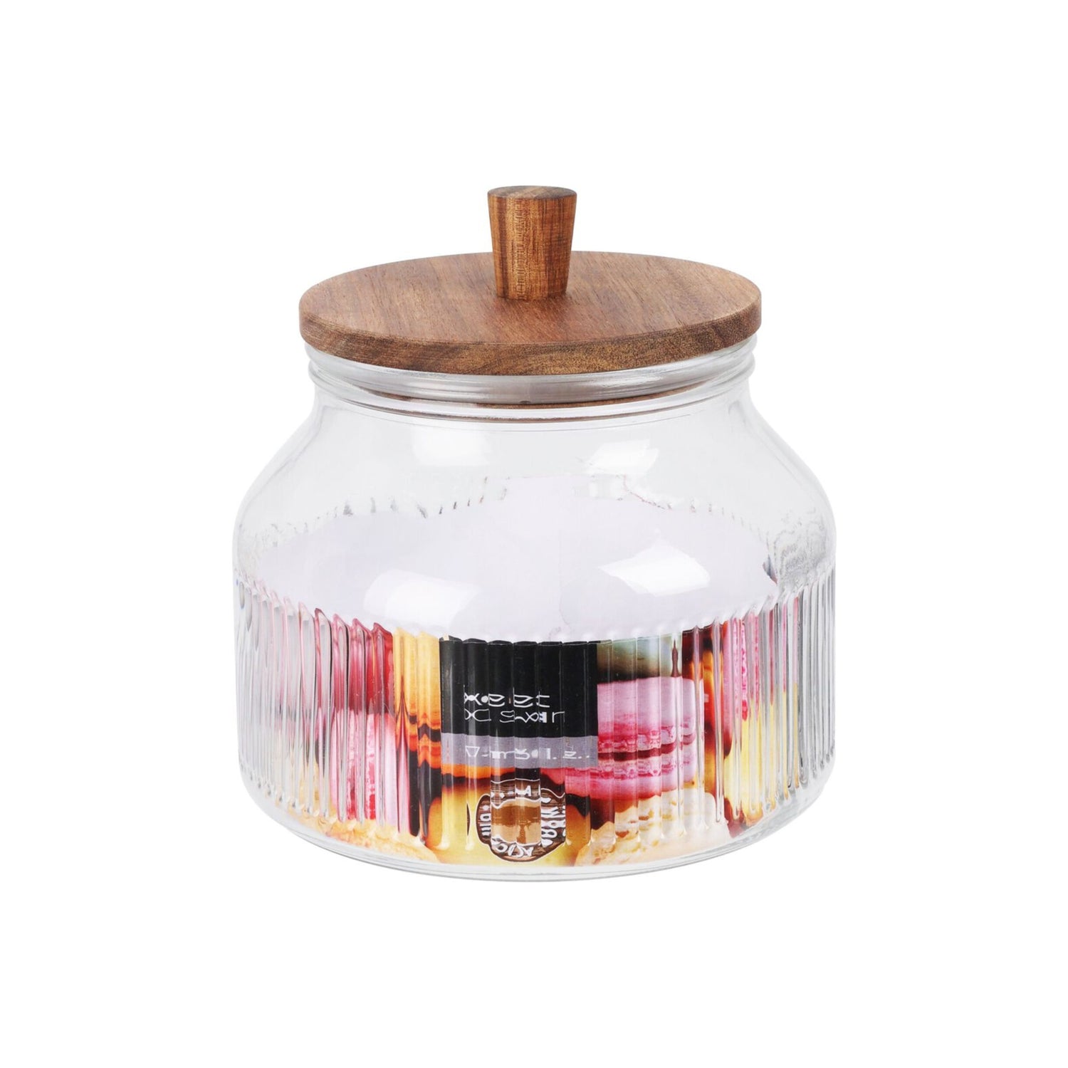 Denne stilige glasskrukken med rillet overflate og lokk i ekte tre gir et rustikt og moderne uttrykk til hjemmet ditt. Perfekt til oppbevaring av tørrvarer som kaffe, pasta, havregryn, snacks eller småkaker – samtidig som den tar seg godt ut på kjøkkenbenken eller i hyllen.