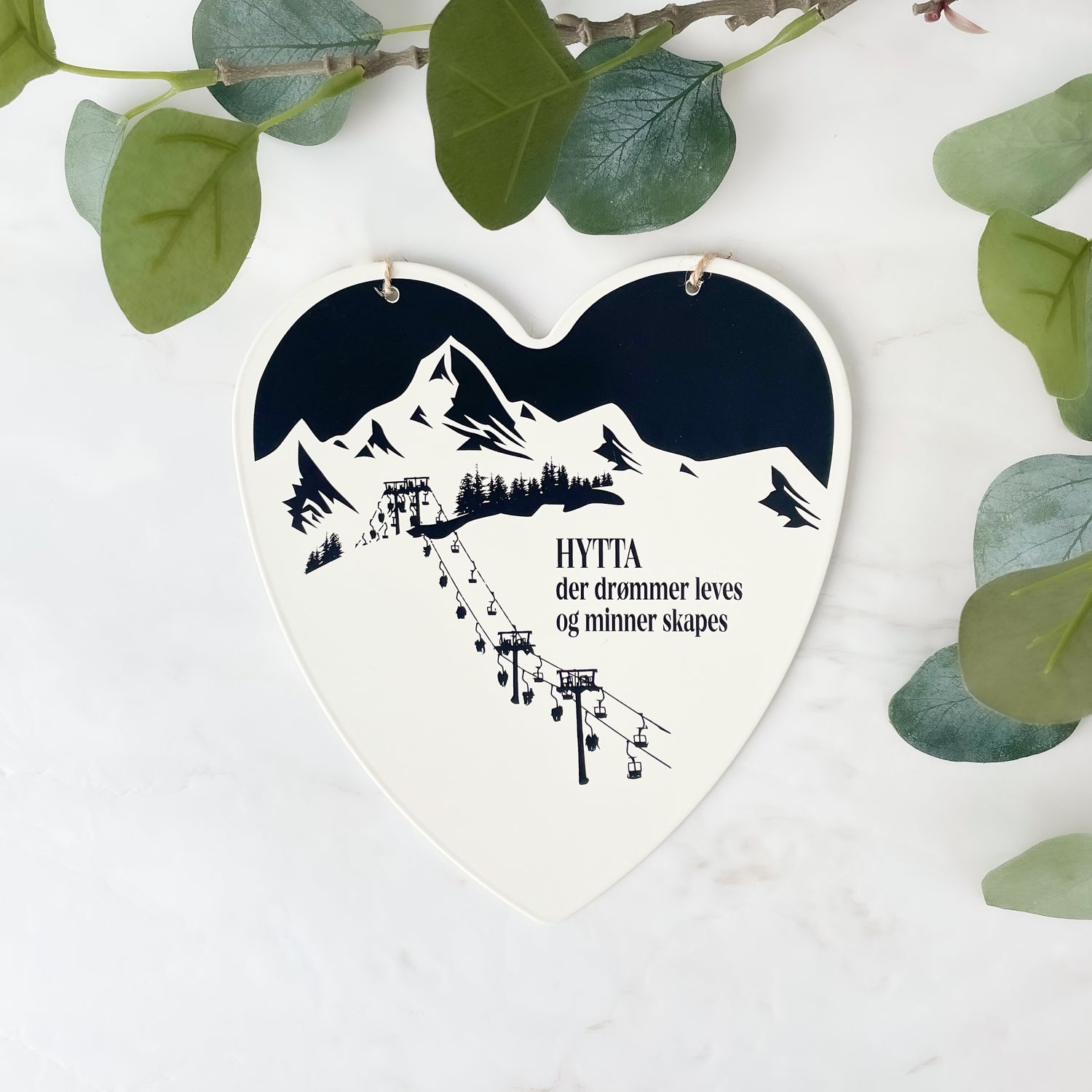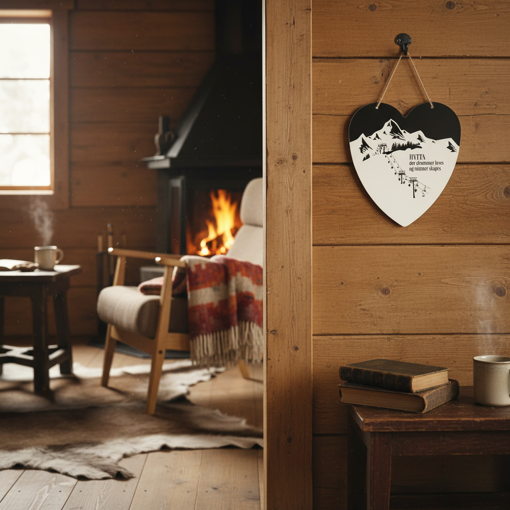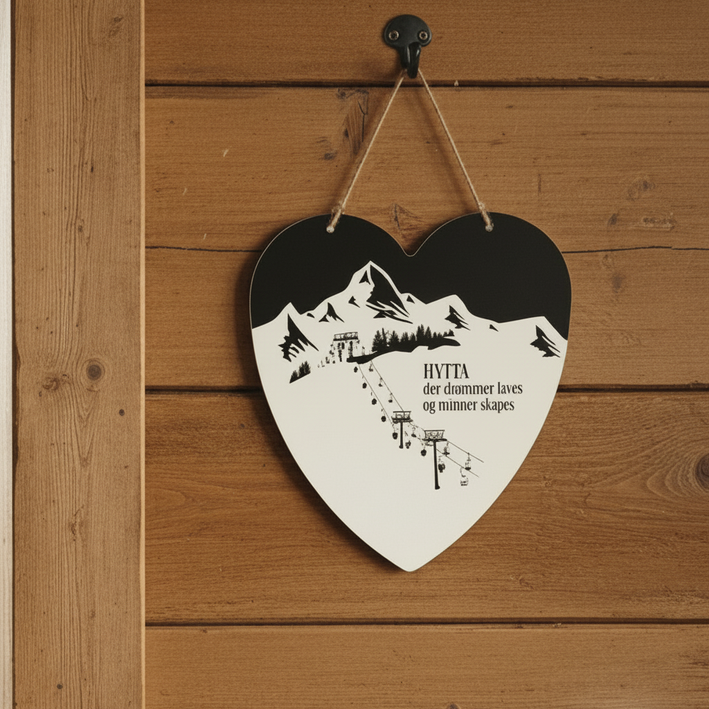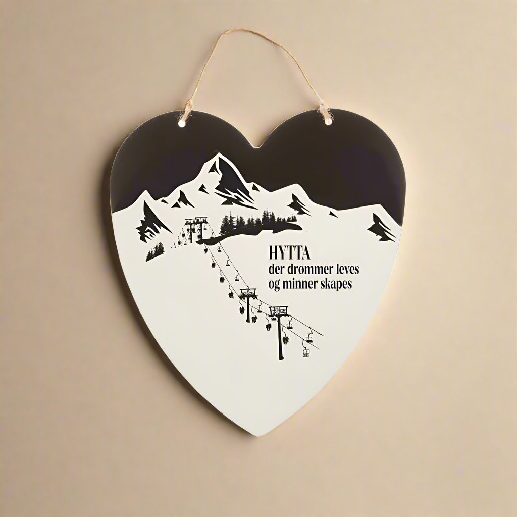 Vakkert hjerteformet skilt med teksten "HYTTA der drømmer leves og minner skapes". Det perfekte skiltet til hytteelskeren!