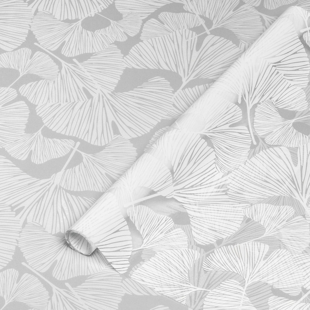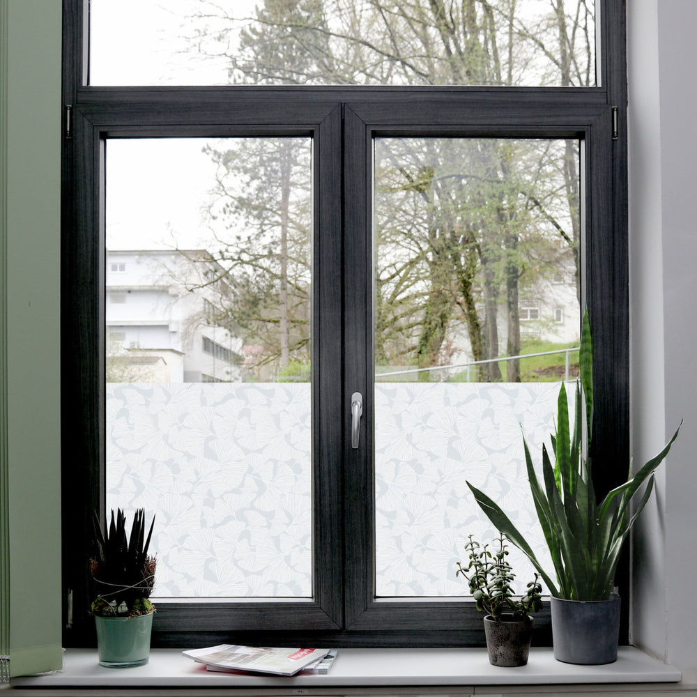 Gi hjemmet et dekorativt uttrykk med Static Eva vindusfolie. Denne elegante folien har et vakkert mønster inspirert av ginkgoblader i hvit toner.