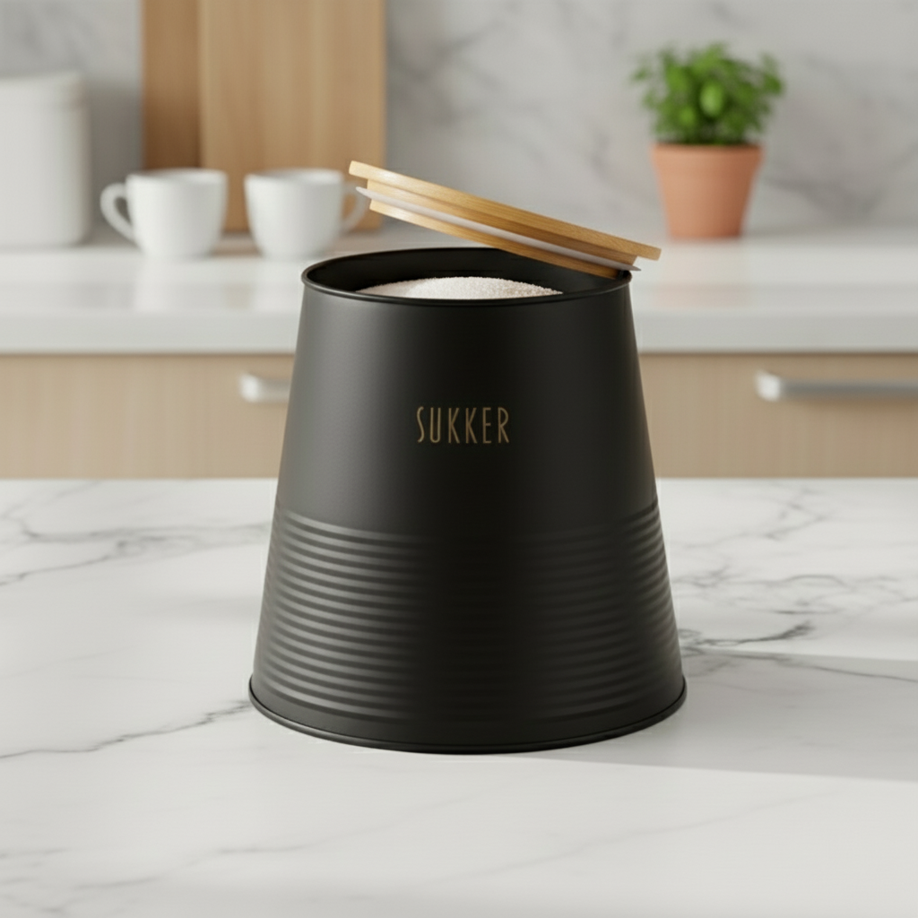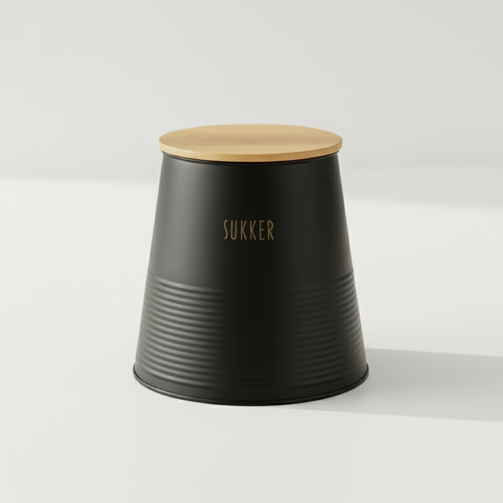 Oppbevaringsboks sukker i sort metall med bambuslokk 14 cm
