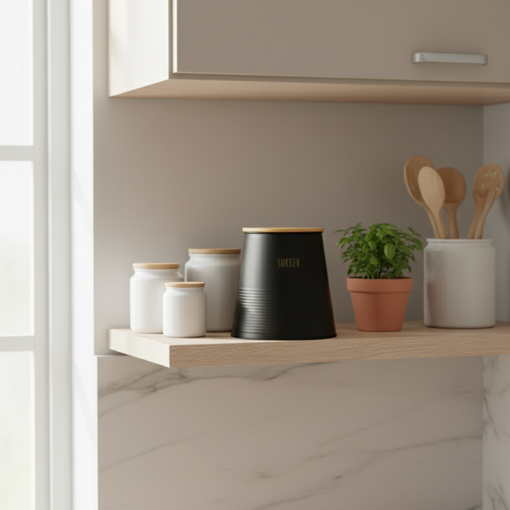 Hold sukkeret lett tilgjengelig og pent oppbevart med denne sukkerboksen i sort metall. Den kompakte størrelsen gjør den ideell på kjøkkenbenken, og bambuslokket i naturfarge gir en varm og fin kontrast til den matte overflaten. Gullskriften «SUKKER» tilfører en tydelig og dekorativ markering.