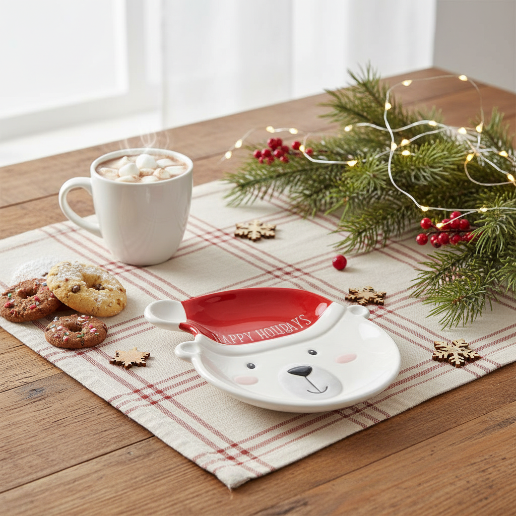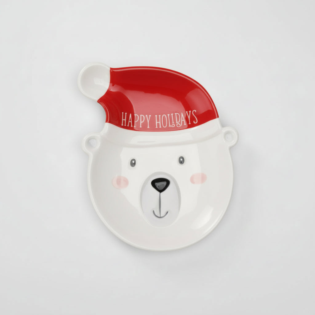 tallerken i keramikk med isbjørn og nisselue juledesign