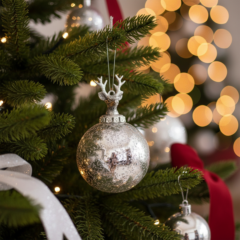 Pynt opp juledekorasjonen din med denne flotte julekulen. Julekulen har dekorert med et majestetisk hjortehode på toppen av kulen.