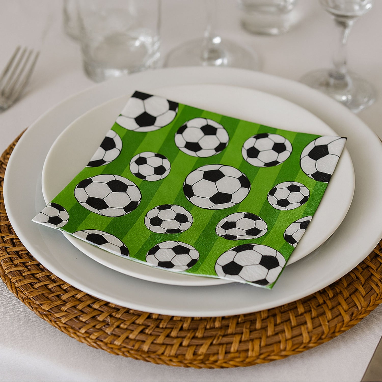 Nydelige trelags servietter i grønn med bilder av fotballer. Passende for bursdag eller fotballarrangement. Serviettene er 3-lags papirservietter og kommer med 20 stk i en pakke.