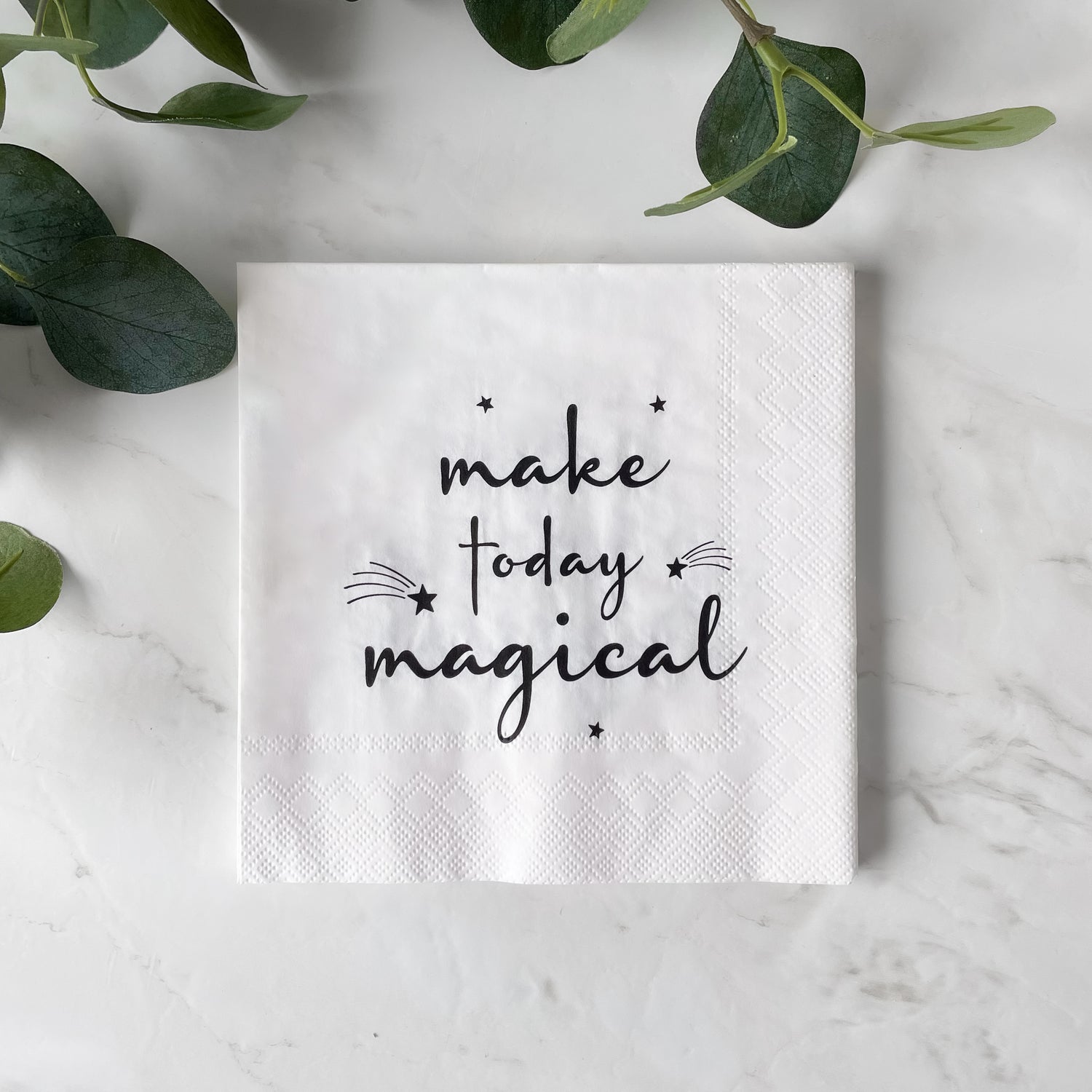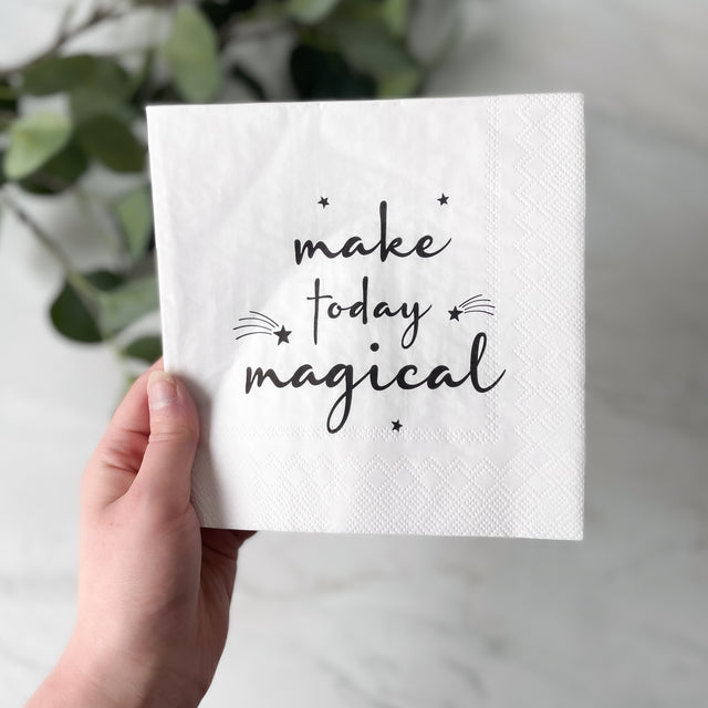 Nydelige hvite servietter med det flotte budskapet "make today magical". Perfekt til dåp, bursdag eller andre selskap. Serviettene er 3-lagspapirservietter og kommer med 20 stk i pakken.
