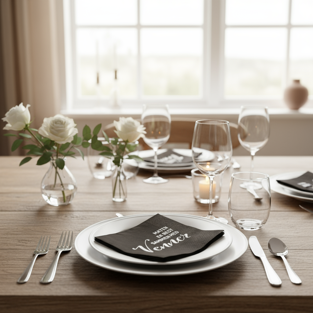 Mørkebrune 3-lagsservietter med teksten "Maten er best sammen med venner"
