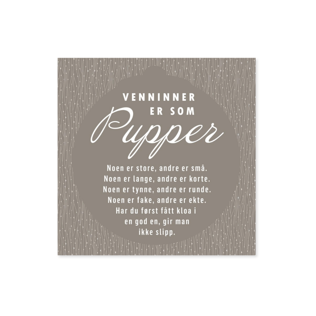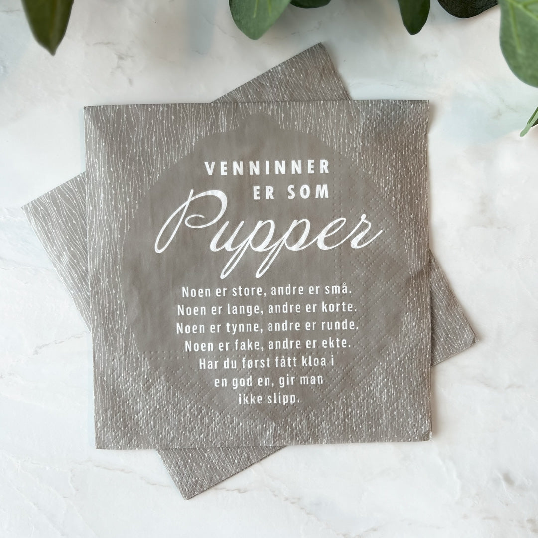 Stilfulle servietter i beige med morsom tekst "Venninner er som pupper" i hvit skrift. Perfekt til jentekvelder eller i gave til en venninne. Serviettene er 3-lagspapirservietter og kommer med 20 stk i en pakke.