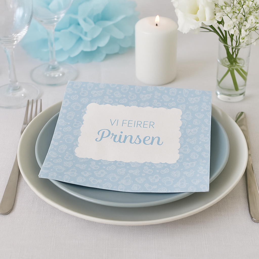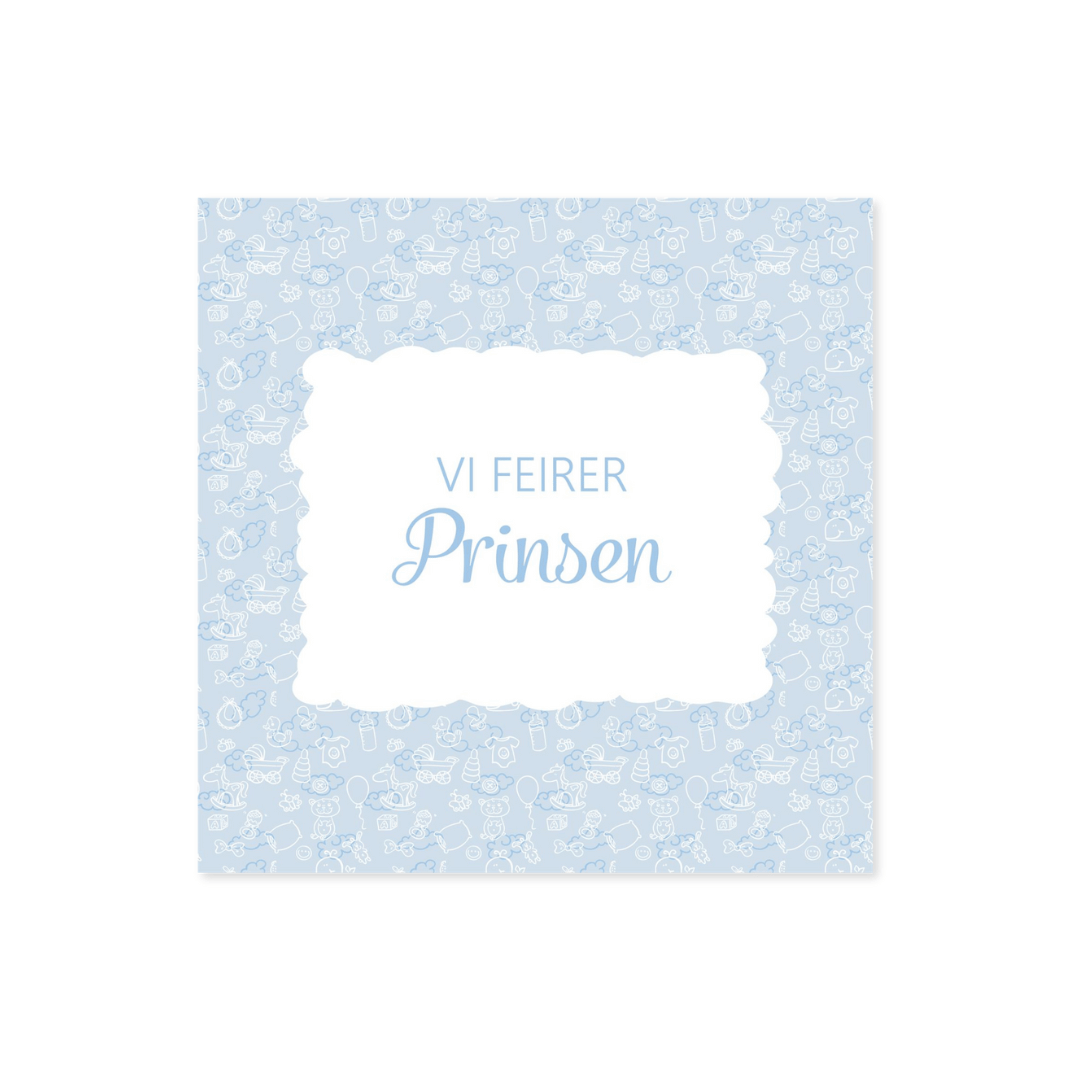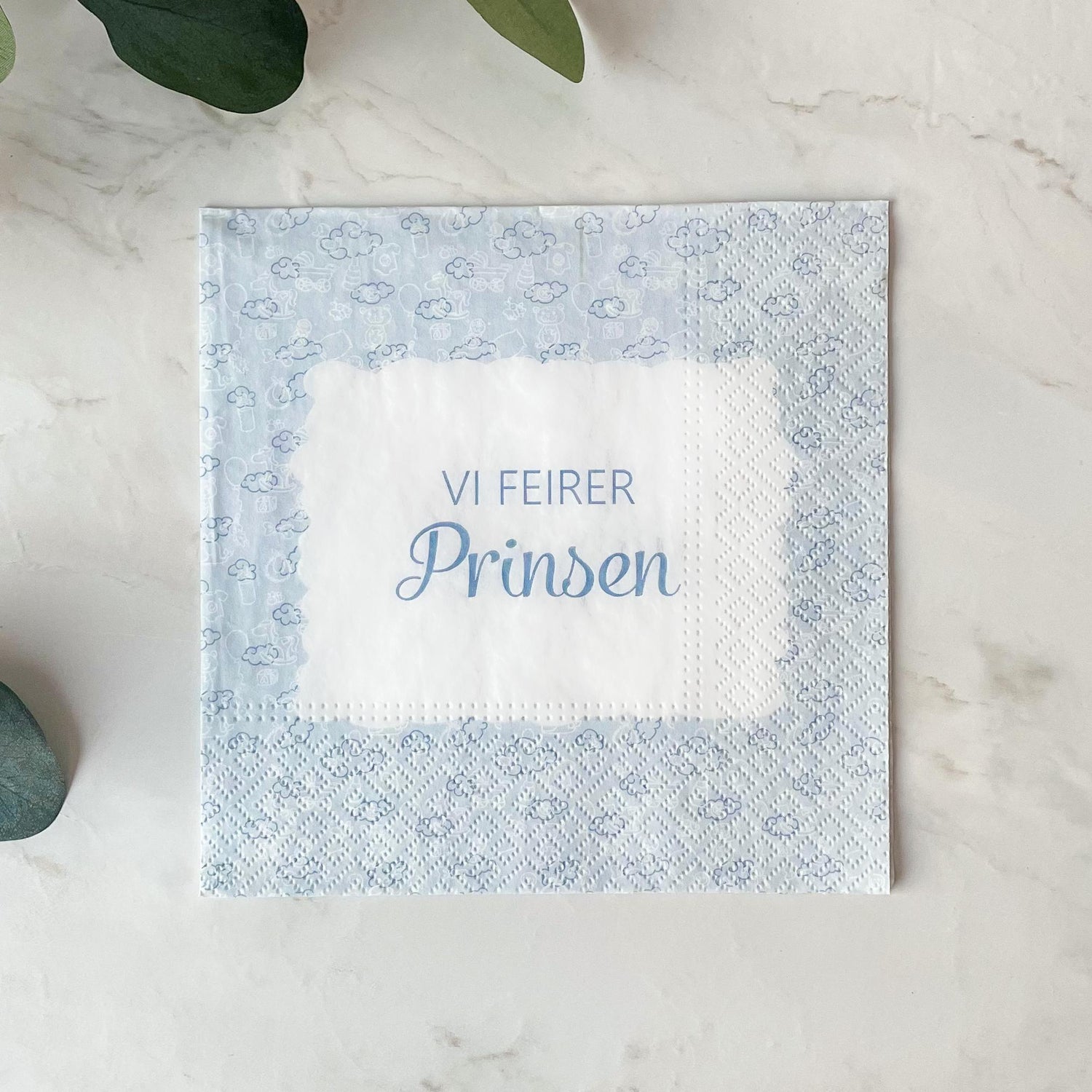 Servietter til dåp og barnebursdager. Disse pene blå serviettene har teksten "Vi feirer prinsen" Serviettene er 3-lagspapirservietter og kommer med 20 stk i en pakke.