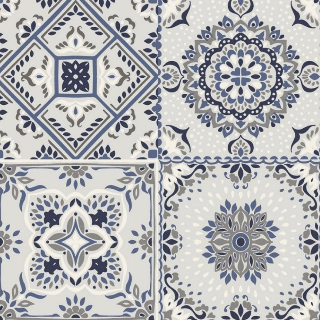 Marokko selvklebende fliser er inspirert av tradisjonelle marokkanske mønsterfliser med detaljerte ornamenter og blå dekor på lys bakgrunn.