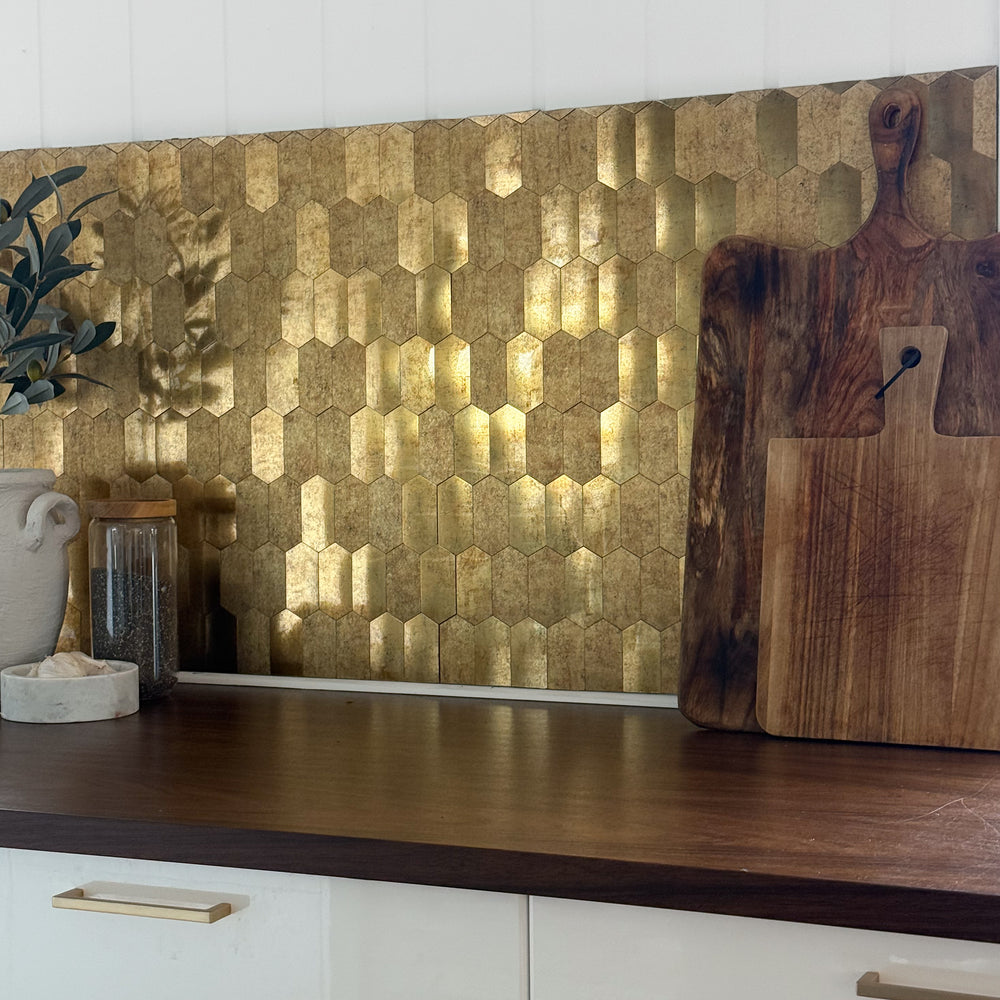 Løft interiøret med et luksuriøst uttrykk med Aria selvklebende veggfliser. Denne flisen kombinerer en gyllen, metallisk finish med et unikt mosaikkmønster i sekskantet og avlang form. Perfekt for deg som ønsker å skape et iøynefallende, men raffinert blikkfang i hjemmet.