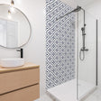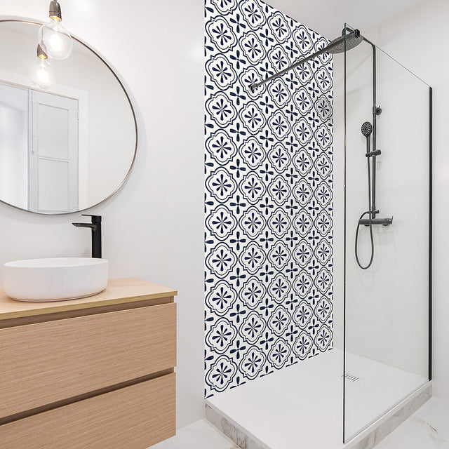 Nova blå selvklebende fliser har et mønster inspirert av klassiske sementfliser med dekorative detaljer i hvitt og mørk blå. Det grafiske mønsteret gir et mer dekorativt uttrykk og tilfører karakter til rommet.