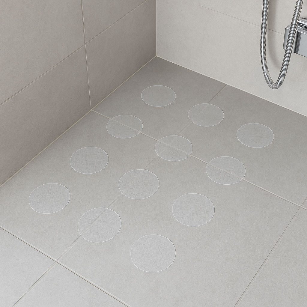 Disse små, diskrete antiskli-punktene kan enkelt festes på gulv, trapper, badekar og dusjer for ekstra trygghet mot fall og sklifare.