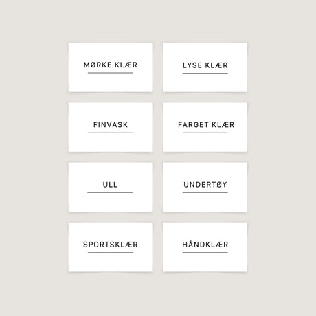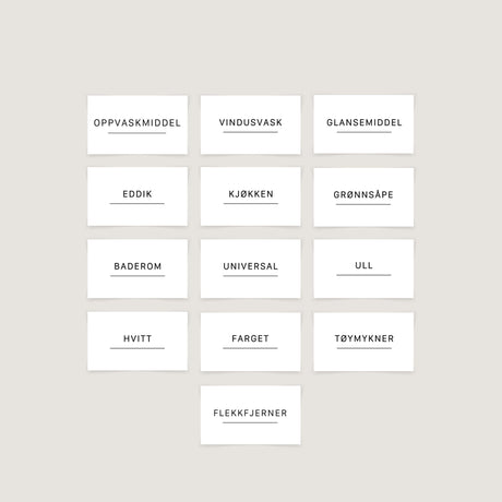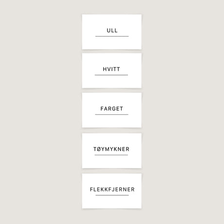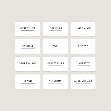 For et ryddig og stilig vaskerom, tilbyr vi etiketter for ulike typer vaskemidler og rengjøringsprodukter. Hell vaskemiddel over i pene beholdere. Merk dem tydelig med etiketter, slik at alt har sin faste plass. Perfekt for å holde oversikt over hva som er tilgjengelig og gir et harmonisk uttrykk.