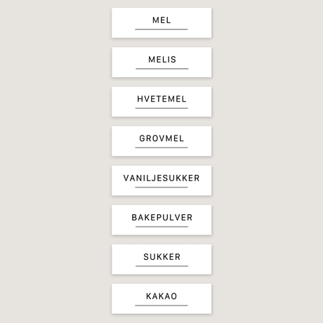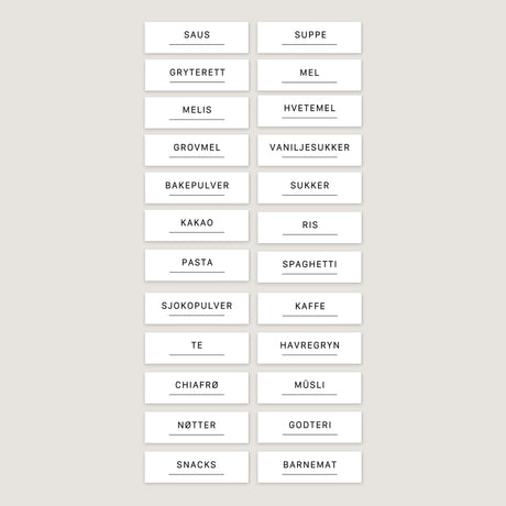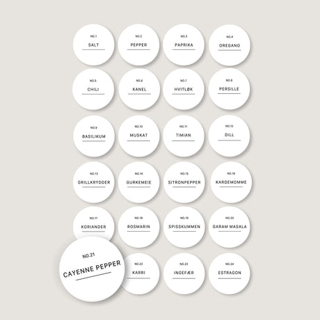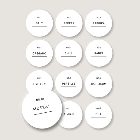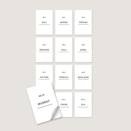 Er du lei av rotete krydderhyller og uorganiserte kjøkkenbenker? Lindas Dekor tilbyr etiketter til krydder, bakeingredienser og tørrvarer. Fest etikettene på glass eller beholdere for å skape en oversiktlig og praktisk kjøkkeninnredning. Du kan velge mellom elegante, minimalistiske design som passer inn i alle typer kjøkken.