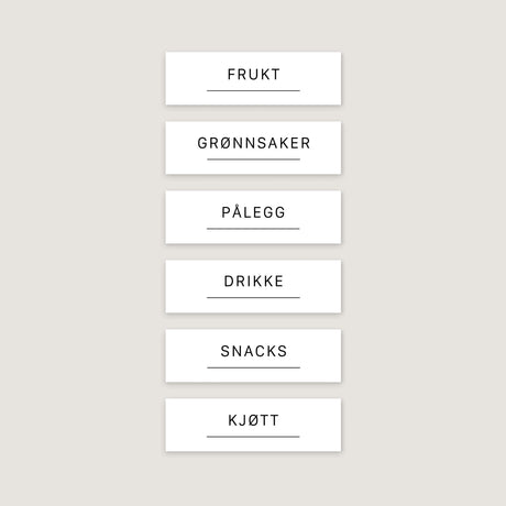 Hos Lindas Dekor finner du et stort utvalg av selvklebende etiketter som gjør det enkelt å få orden på hjemmet. Våre etiketter kan festes på alle glatte overflater, som glass, plast og metall. Vi anbefaler at de er rene og fri for støv. De er perfekte for deg som liker et ryddig hjem og ønsker et rent uttrykk på kjøkkenhyller, baderomsskap og oppbevaringsbokser.