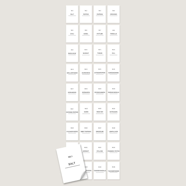 Disse etikettene er ideelle for enhver kjøkken entusiast som ønsker orden og estetikk. Våre krydderetiketter gir deg en elegant og praktisk løsning for krydderorganisering, og passer perfekt til både moderne og tradisjonelle kjøkken.
