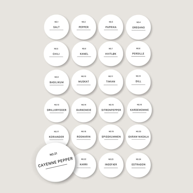 Denne pakken inneholder etiketter til: Salt, Pepper, Paprika, Oregano, Chili, Kanel, Hvitløk, Persille, Basilikum, Muskat, Timian, Dill, Grillgrydder, Gurkemeie, Sitronpepper, Kardemomme, Koriander, Rosmarin, Spisskummen, Garam Masala, Cayennepepper, Karri, Ingefær, Estragon