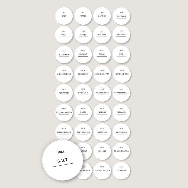 Organiser kjøkkenet ditt med våre runde etiketter til krydder. Perfekt for å holde oversikt over alle krydderne dine på en stilren og funksjonell måte.