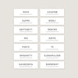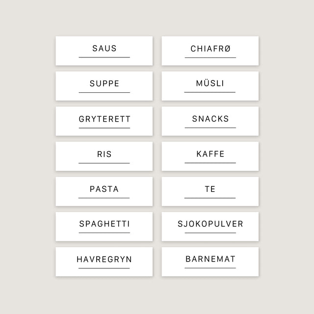 Denne pakken inneholder etiketter til: Saus, Suppe, Gryterett, Ris, Pasta, Spaghetti, Hvaregryn, Chiafrø, Müsli, Snacks, Kaffe, Te, Sjokopulver/oboy, Barnemat