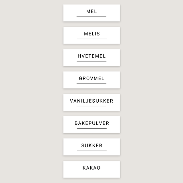 Denne pakken inneholder etiketter til: Mel, Melis, Hvetemel, Grovmel, Vaniljesukker, Bakepulver, Sukker, Kakao