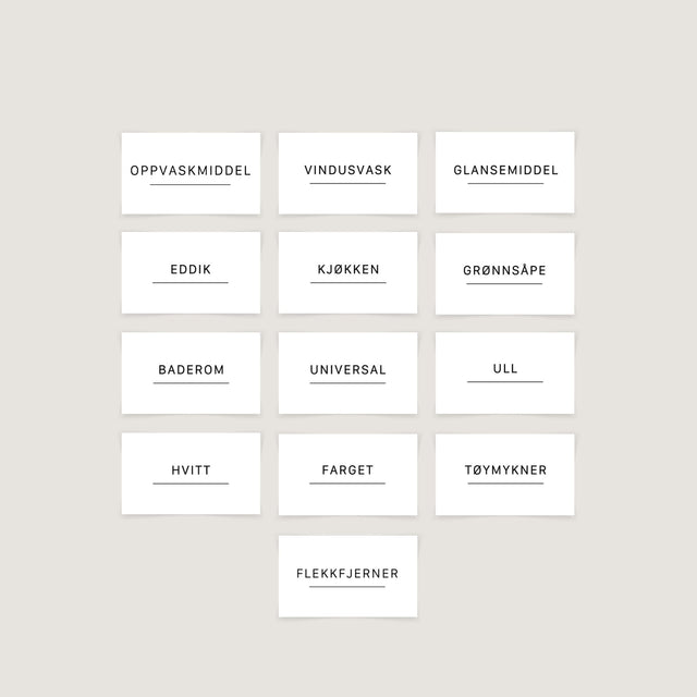 Denne pakken inneholder etiketter til: Eddik, Oppvaskmiddel, Vindusvask, Kjøkken, Baderom, Universal, Glansemiddel, Grønnsåpe, Ull, Hvitt, Farget, Tøymykner, Flekkefjerner