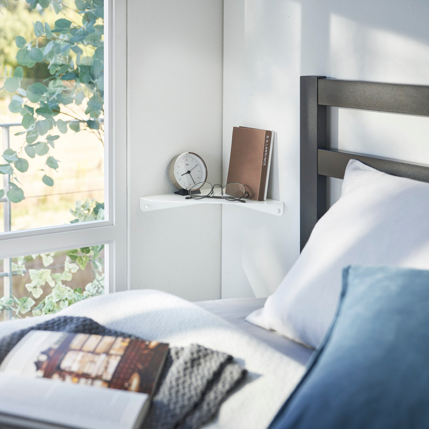 Hvit veggmontert hjørnehylle brukt som nattbord ved siden av en seng, med klokke, bok og briller på toppen.