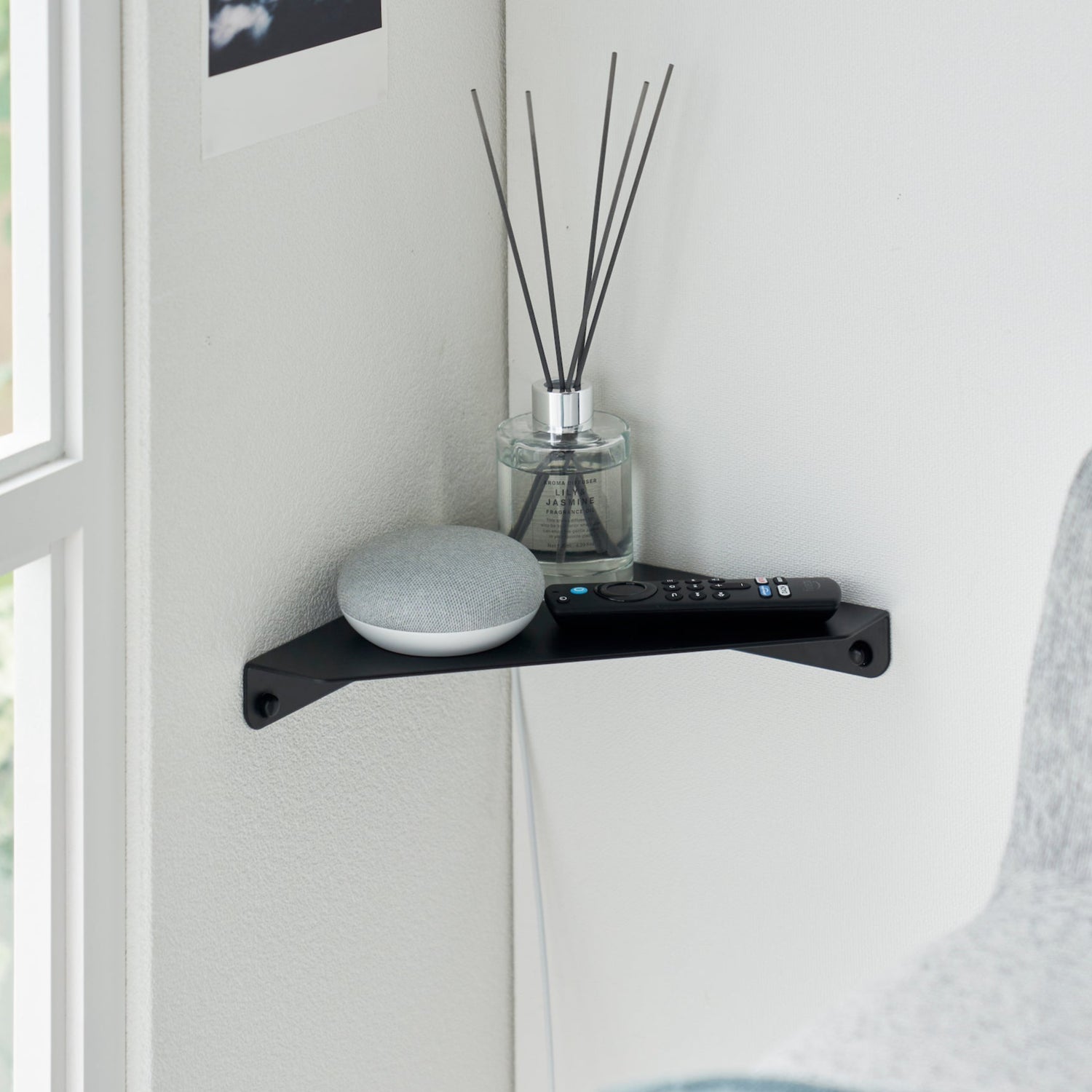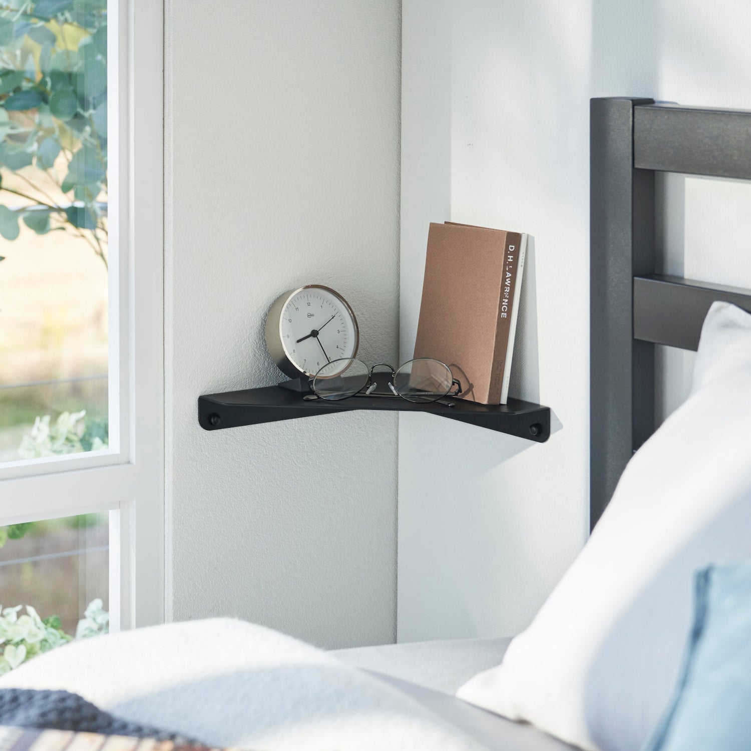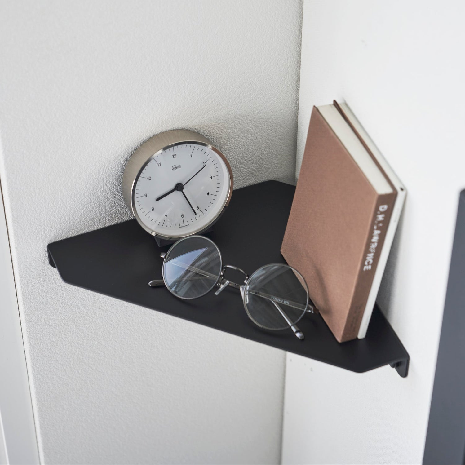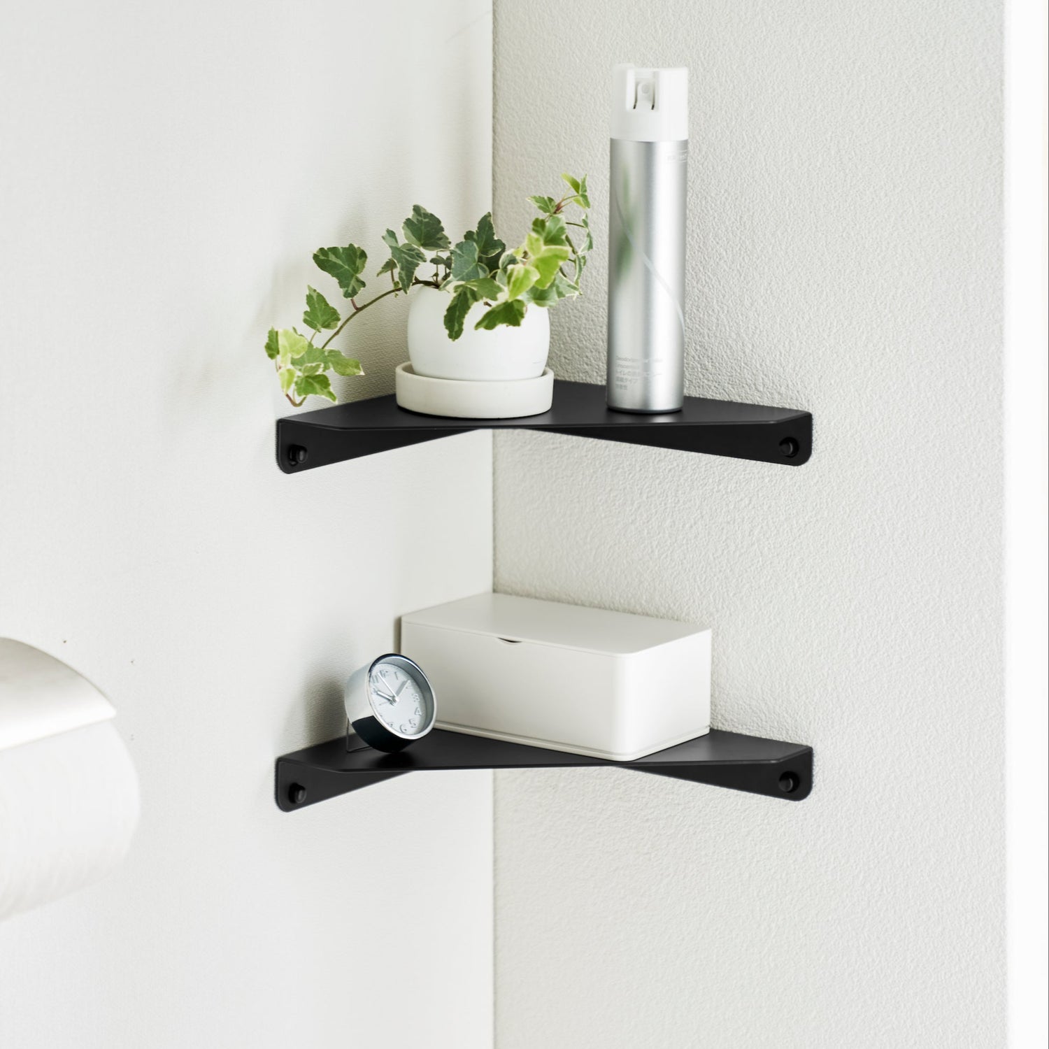 En sort hjørnehylle som utnytter veggplassen optimalt. Det minimalistiske designet gir en praktisk oppbevaringsløsning for små gjenstander som bøker, klokker, briller eller dekor.